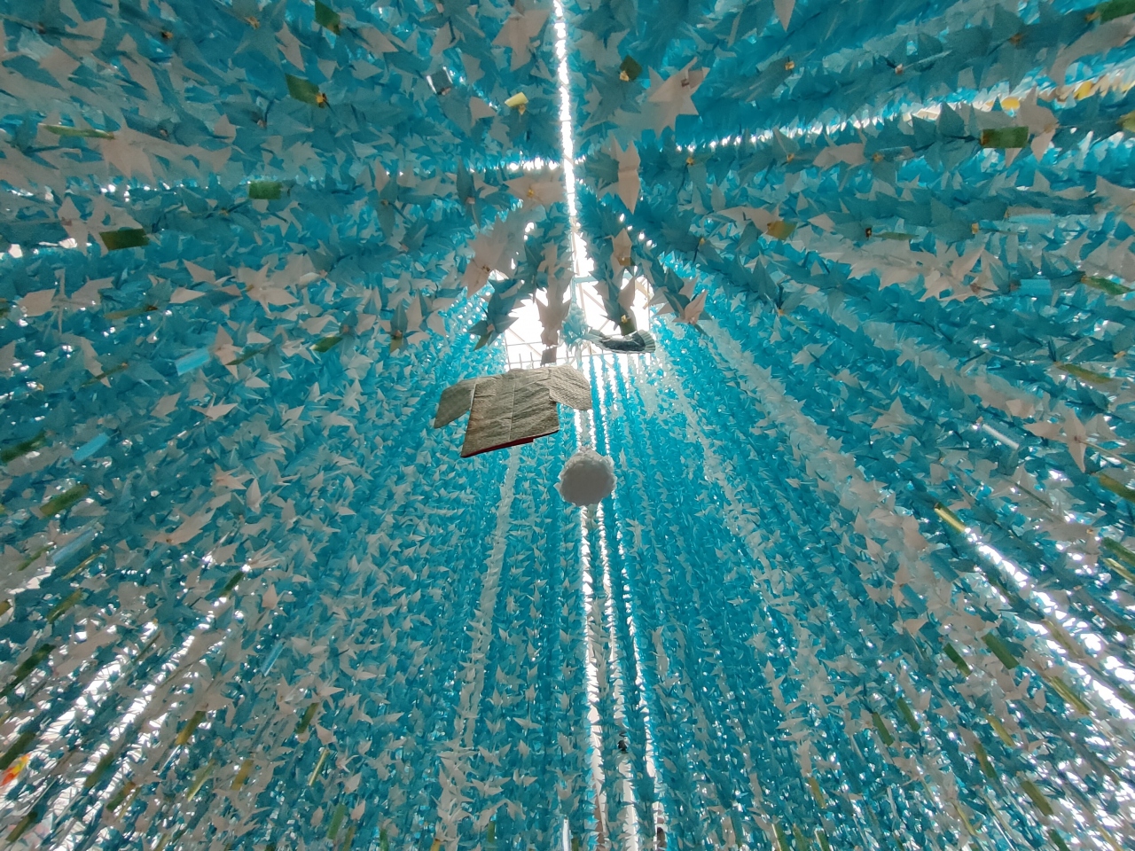 薄いブルーと白の色合いが爽やかで、特に中央部の真下から眺めると、現実世界とは異なるアートな空間に迷い込んだような不思議な光景を見ることができました。