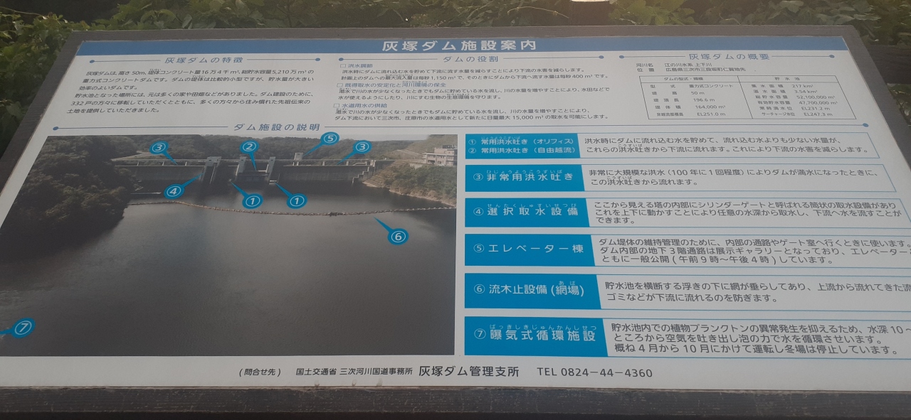 ちょうど夕方でしたが、ダムの目の前の灰塚湖の対岸のあたりから夕陽の映えるダムを見れました。