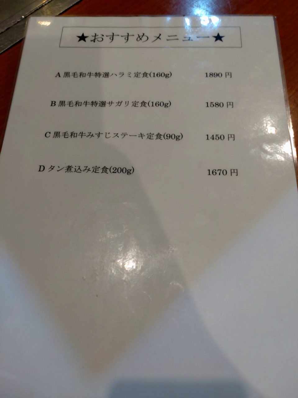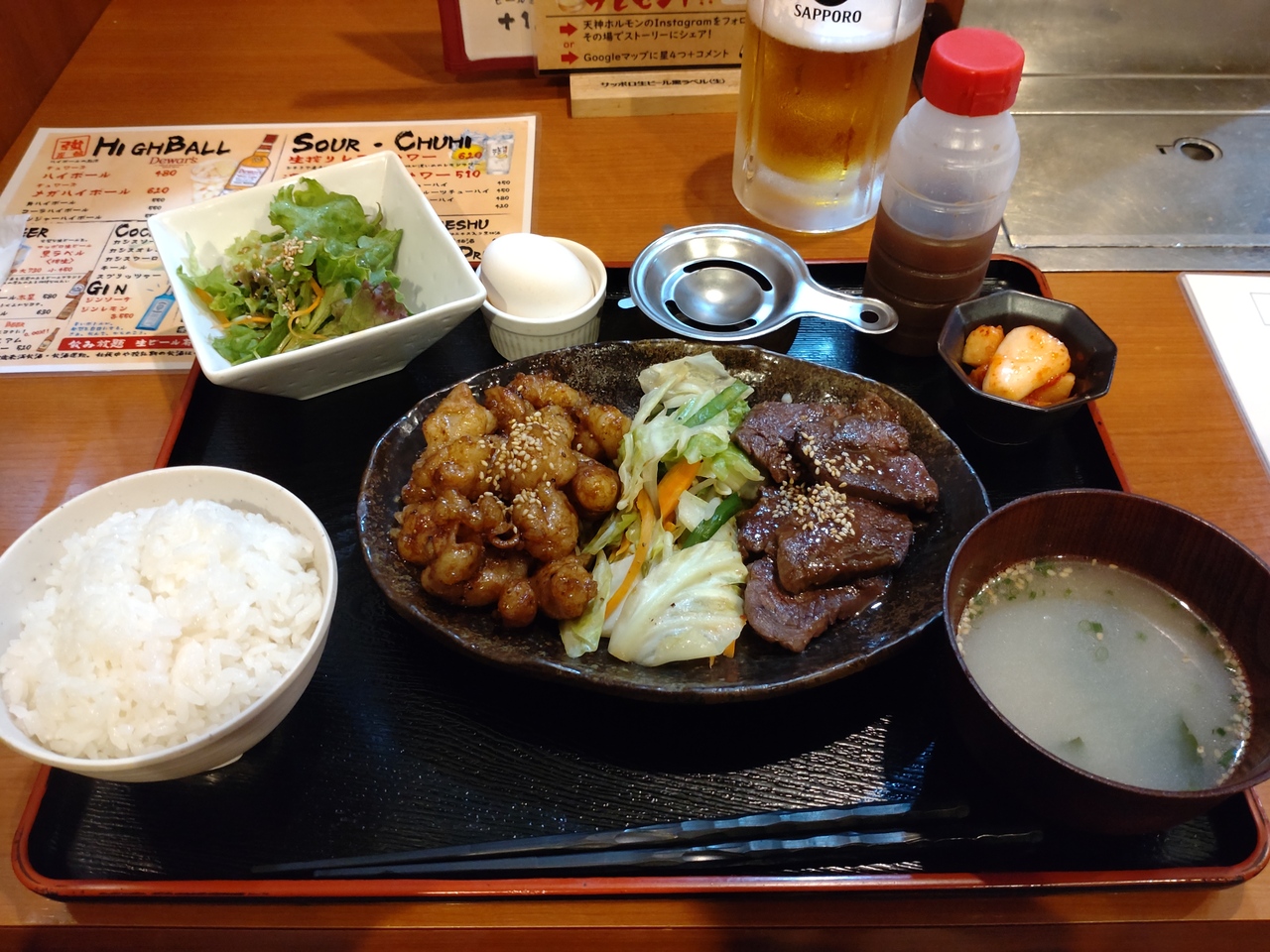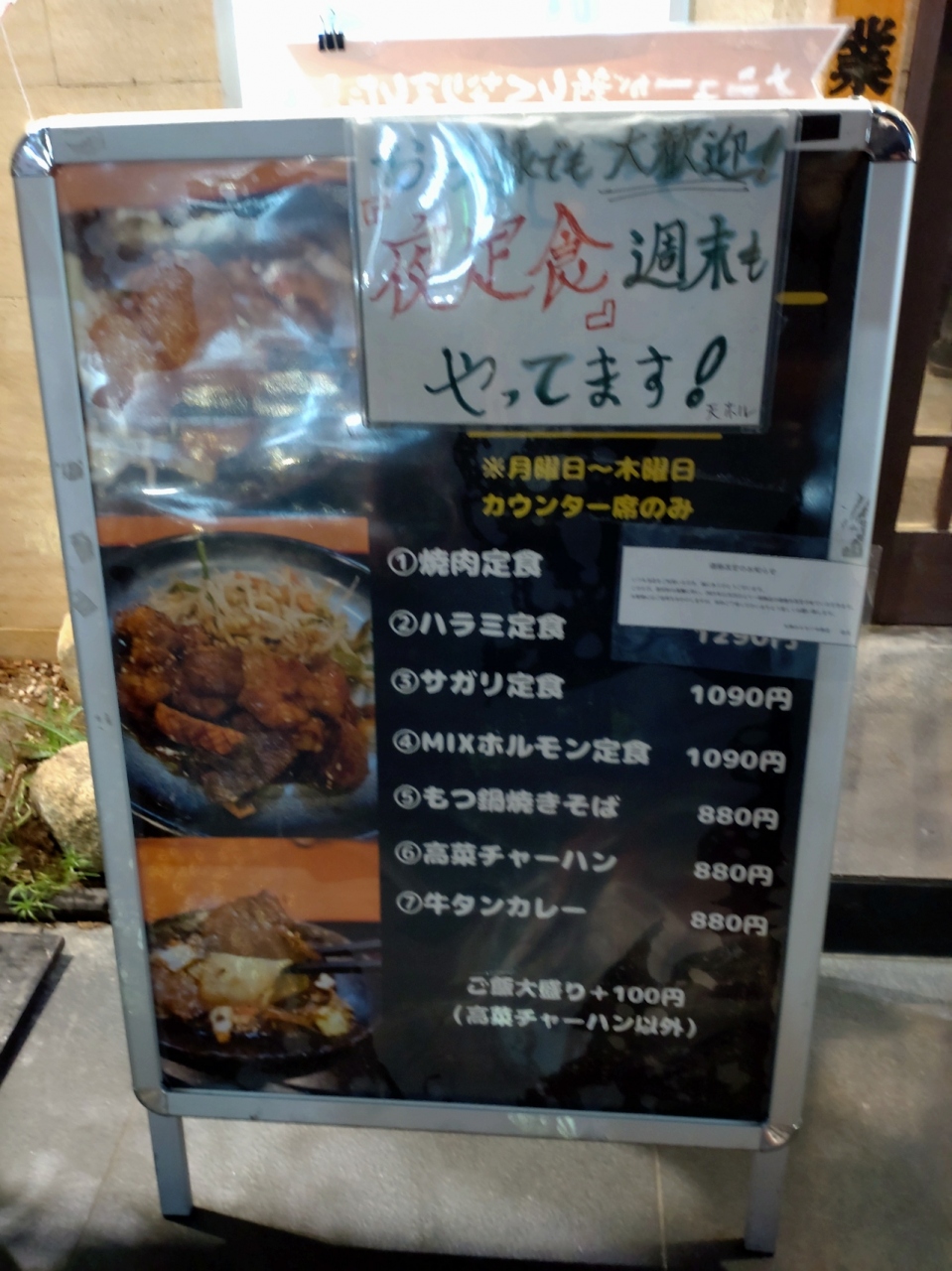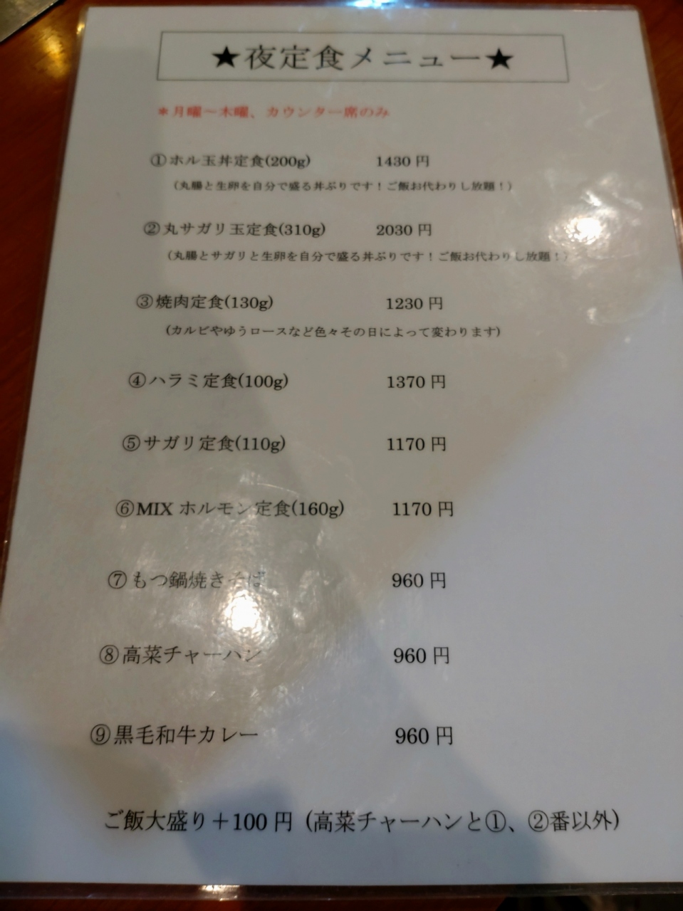 国体道路のソニーストア、天神のドン・キホーテを左に曲がった奥の通りにある炭火焼肉店。焼肉と定食、両方食べられるお店で、カウンター席もあるので一人でも安心。一人でも七里焼肉が楽しめる。ソラリアや博多のお店よりも落ち着いている。夜定食は、メニューには月曜~木曜とあるが、金曜日でも頼めました。そこで「丸腸サガリ玉定食」をオーダー。オーダーは最近流行りのQRコードで。