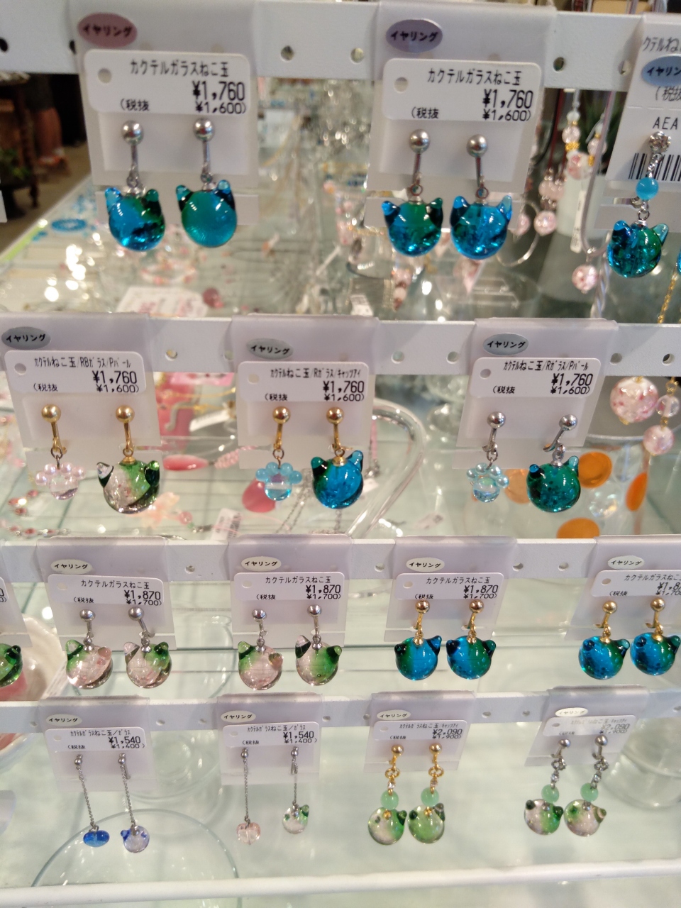 いろんなアクセサリーを取り扱っています。お店は天然石のアクセサリーなども豊富ですが、ガラス関係の商品も多くて、ピアスやイヤリング、ネックレス、ブレスレットなどが豊富です。1つ1つが小さく、たくさんの種類がならんでいて目移りします