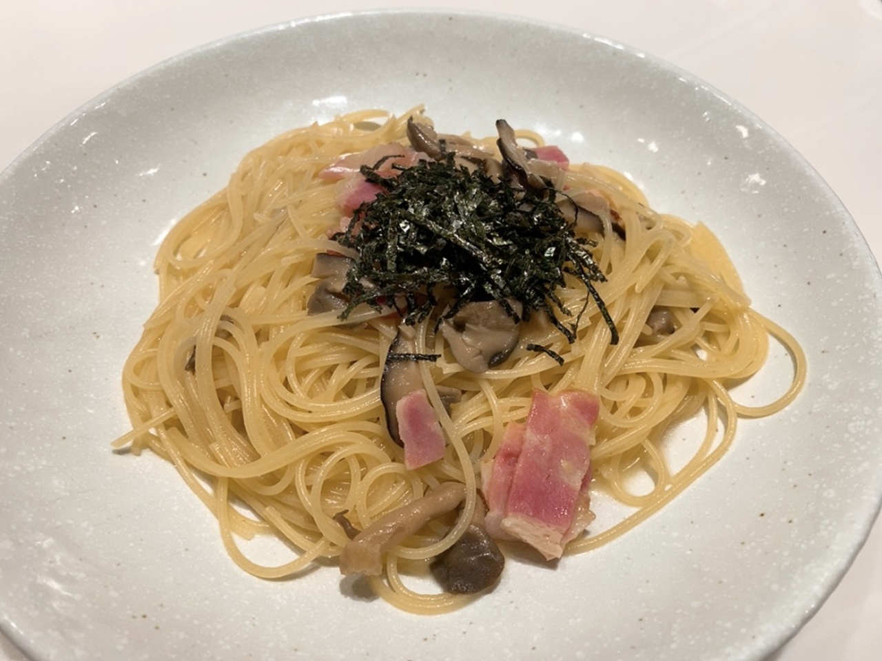 キノコとベーコンのバター醤油パスタ…ちょっと間の抜けた味でした…。