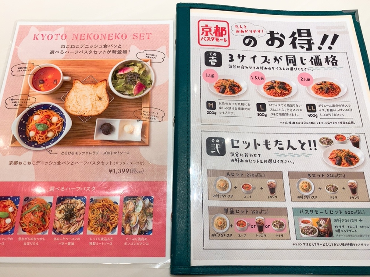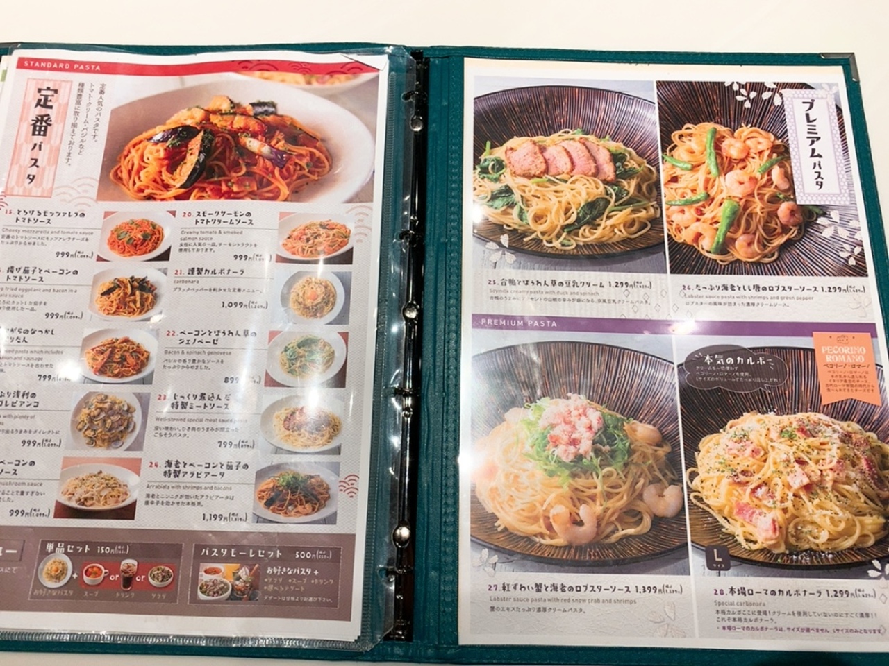 パスタはM, L, LLサイズから選べ、どのサイズを選んでも大盛り料金はかからないとのことなので、男性など大食いの方には嬉しいサービスかもしれません。