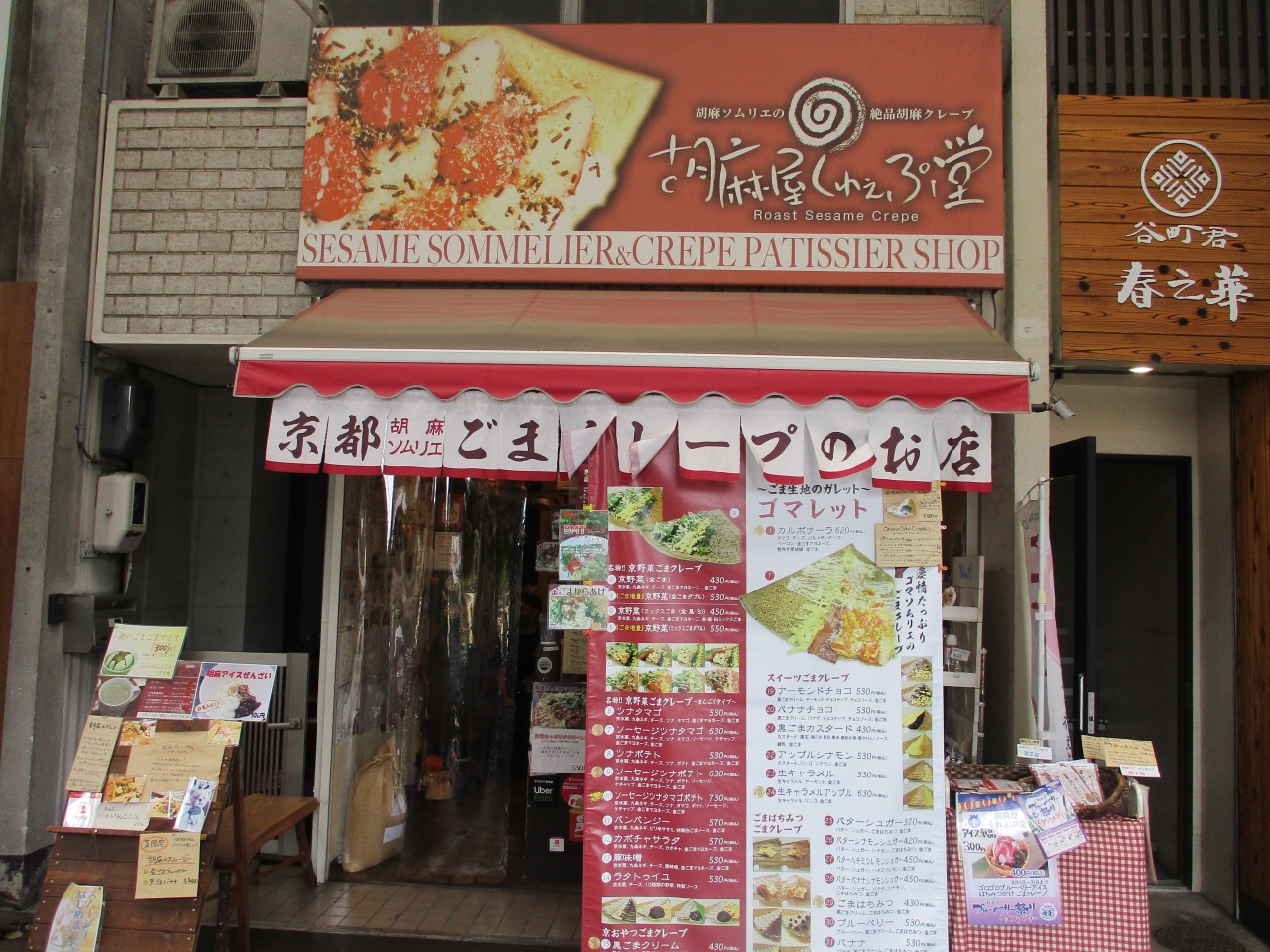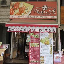 三条会商店街の中にあるクレープ屋さんです。他のクレープ屋さんと違う特徴はクレープ生地にごまが練りこまれていることです。お店の前には大きくメニューが書かれた垂れ幕?があります。種類がとても多いです。スイーツ系の他京野菜を使った食事系も充実しています。クレープ好きな方はきっと食べたくなる、満足のお店だと思います。