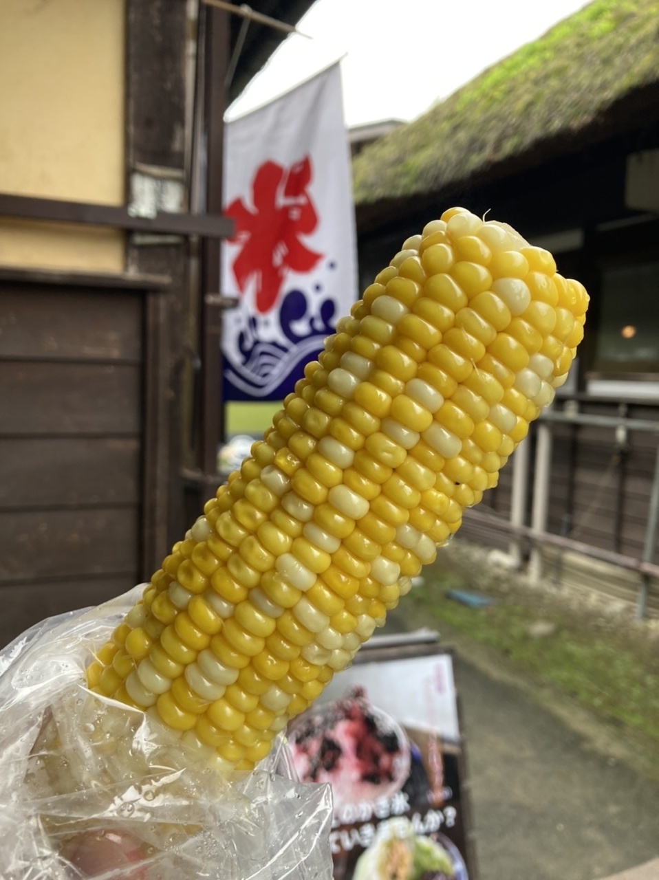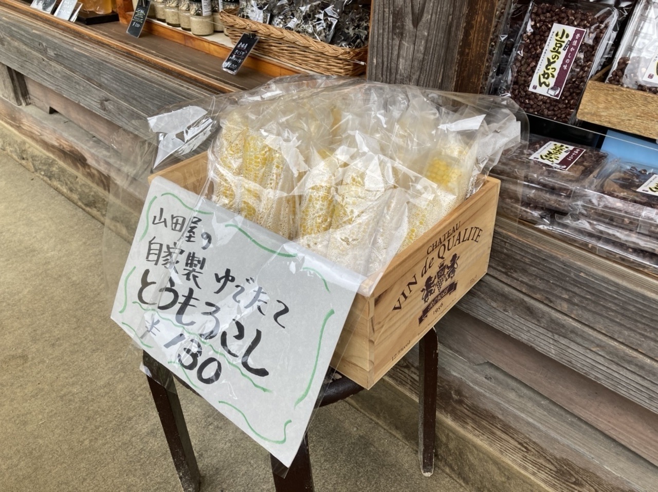 大内宿の町並みを見ながらぶらぶら。ふと立ち寄ると店頭に美味しそうなゆでとうもろこしを見つけました。130円と破格の安さ。女性の店員さんが、中にいたおばあちゃんが作った、と教えてくれました。