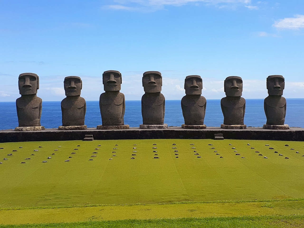 海沿いに並べられた7体、そしてイースター島を連想させるため3体が斜面に建っています。
