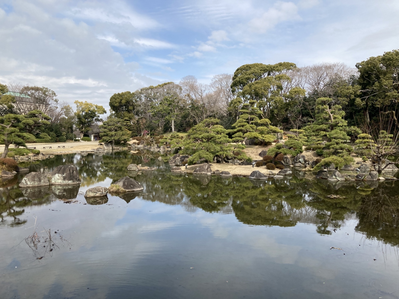 天王寺公園の一画、市立美術館の隣にある日本庭園です。住友家が造営したお庭で真ん中に池が、奥の林の中にはお茶室が配されています。木々に囲まれているので都会の真ん中とは思えない静けさです。それでも昨今はハルカスはじめ高いビルが木々の向こうには見えはしますが。お茶室は借りることができるようです。