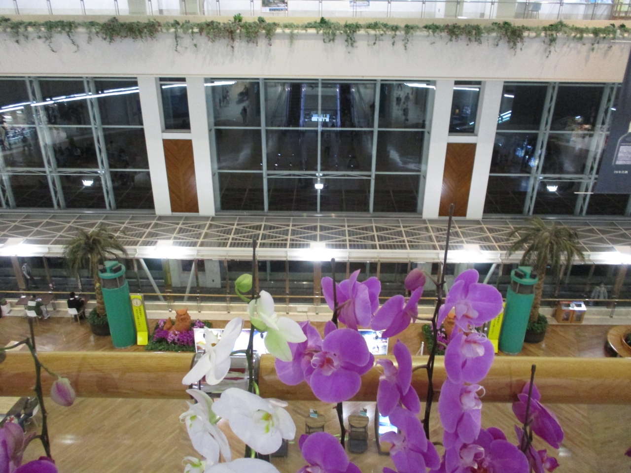 那覇空港ターミナル内には花が飾られていました。カラフルな花で南国気分を感じます。外に飾られている空港はありますが、フロアを移動するエスカレーター脇にもあり、随所にお花が飾られていて、南国感あふれる素晴らしいターミナルでした。