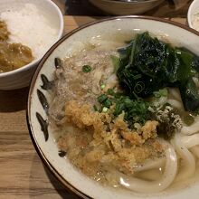 JR南武線尻手駅から徒歩5分くらい、川崎幸市場(南部市場)内にあるうどん屋です。ただのうどん屋ではなく、大阪発祥の「かすうどん」を供する珍しい店です。大阪・南河内地方で昔ながらに親しまれてきた牛ホルモン(=油かす)を油で揚げたものが入っており、その旨味と歯応えがクセになります。営業時間は短く、日曜祝日はお休みですのでご注意を。