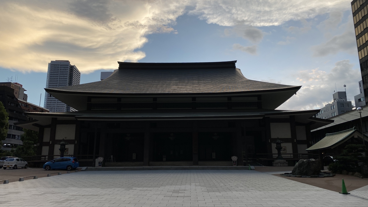 御堂筋の氏神様のような存在感のある真宗大谷派 難波別院。南御堂の名前の通りで、北御堂と共にあります。北御堂はちょっと入りずらいのですが、南御堂は入りやすい雰囲気どころか門の代わりにホテルになっているビルがあるのです。また、夜間の風情も非常に良いです。