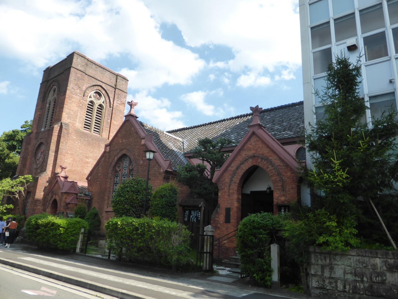 京都御所の近く、烏丸通丸太町の交差点から北へ上がった西側に「日本聖公会 聖アグネス教会」が建っています。北東の角に三層の鐘楼、南東角には礼拝準備室(ベストリー)が設けられ、ゴシック様式の重厚な外観(煉瓦積み)は、明治期のキリスト教会堂の特色を伝えています。京都市指定有形文化財にも指定されたとても素敵な教会です。