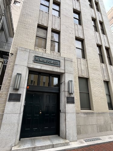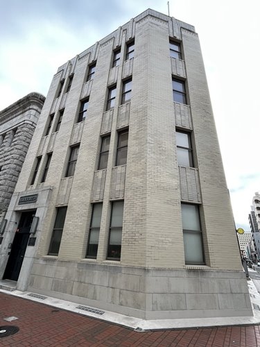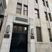 馬車道の両側には個性豊かな意匠の昭和レトロな建物が何棟も立ち並んでいます。馬車道大津ビル。1936年(昭和11年)竣工で、もとは東京海上火災保険のビルでした。シンプルな外観の小ぶりなビルですが、近づいてみると細かなタイル張りで味わいがありますね。漆黒の入り口扉とのコントラストもなかなかシックです。横浜市認定歴史的建造物に指定されています。