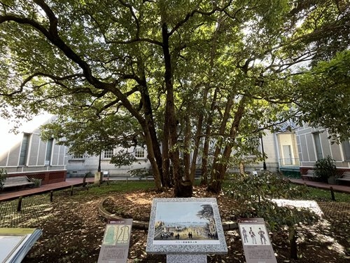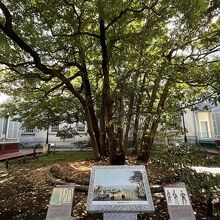 開港資料館の中庭にあたる場所にある巨木です。日米和親条約が締結されたのがこの付近の場所ですが、ペリーに随行していた画家ハイネが描いた「ペリー提督横浜上陸」に中庭で枝を広げる「たまくす」に似た木が描かれており、現在の大木の先祖なのではないか、とされています。慶応年間の火事や関東大震災を乗り越えて現在も元気に枝を広げていました。