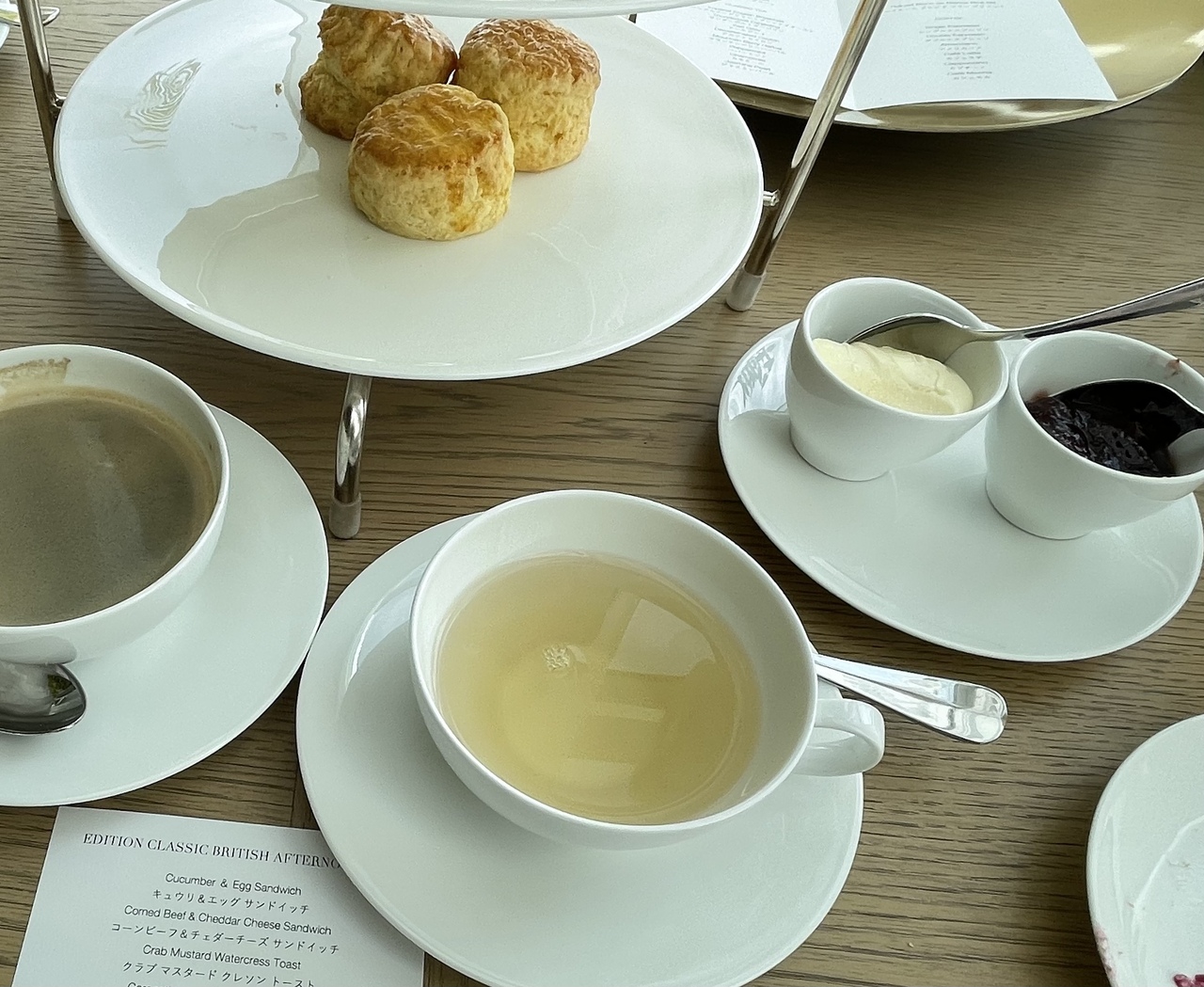 エディションホテル東京虎ノ門のロビーフロアに、カフェラウンジがあり、緑に囲まれた雰囲気でアフタヌーンティーをいただくことが出来ます。