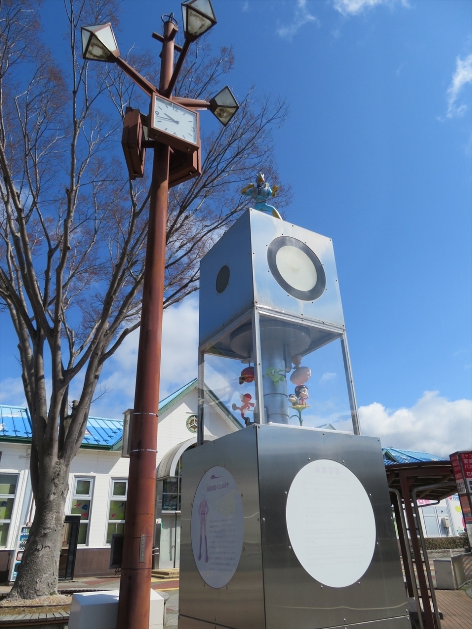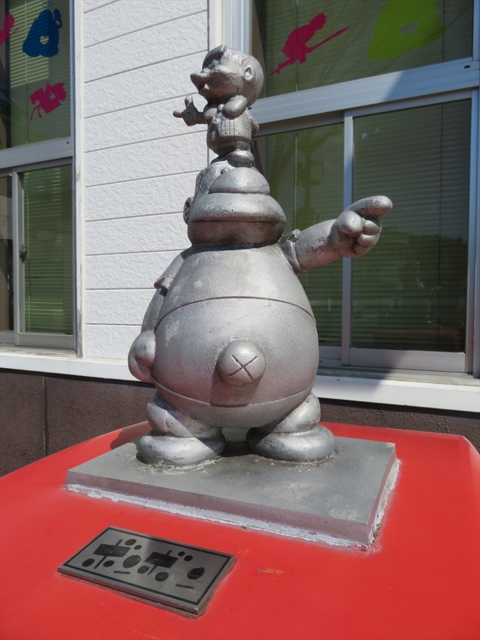 一番目を惹くのは等身大以上の大きさでカラフルに色付けされた仮面ライダーやサイボーグ009のメンバーですが、駅前には目立たないながらもマンガからくり時計があったり、そのほかにも『佐武と市捕物控』の登場人物、さるとびエッちゃん、ボンボン、スカルマンなどと言ったマイナーなキャラクターの作品も多数あります。