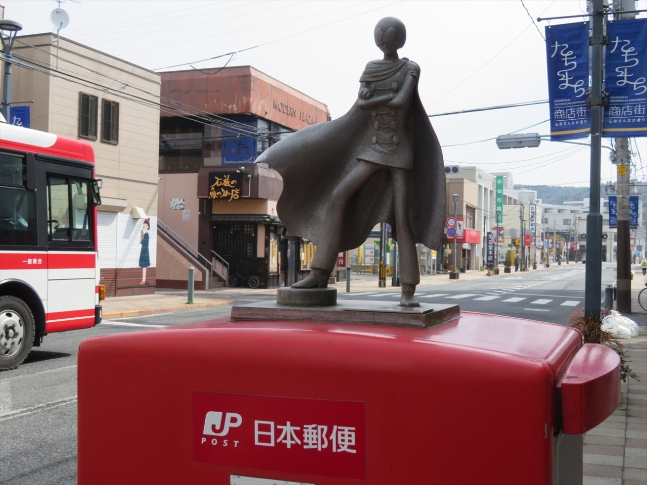石巻マンガロードは、JR石巻駅から石ノ森萬画館(漫画家・石ノ森章太郎氏の記念館)へと続く約1㎞ほどの道筋で、石ノ森氏の漫画キャラクター像が目白押し。