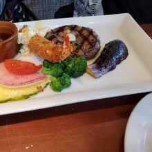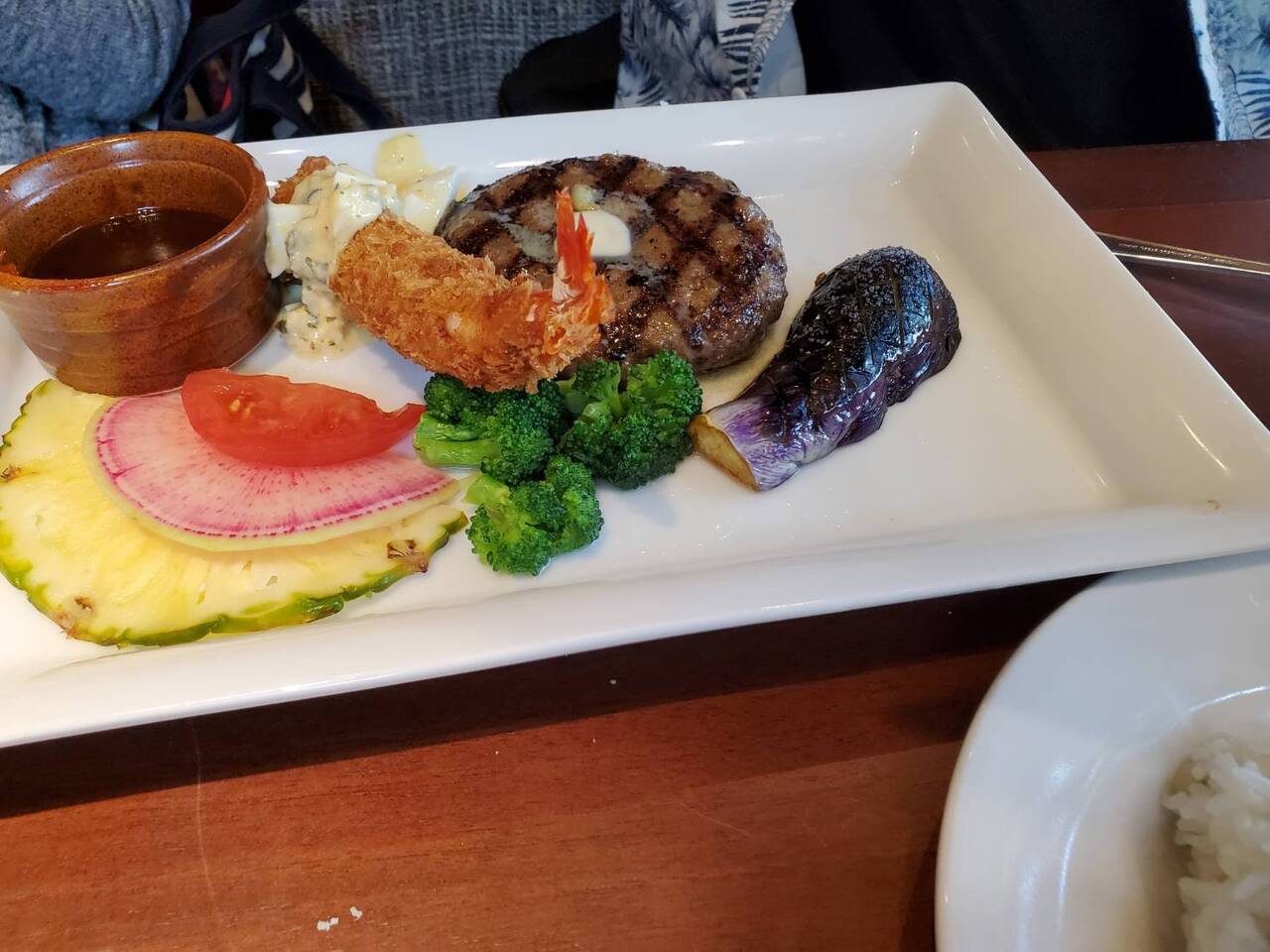 ハンバーグをたべてきました。エビフライもトッピングされているものにしましたが、エビがぷりっとした食感でなかなか美味しかったです。ハンバーグも肉汁たっぷりでジューシーなもの。盛り付けも華やかで彩りが良かったなと思いました。