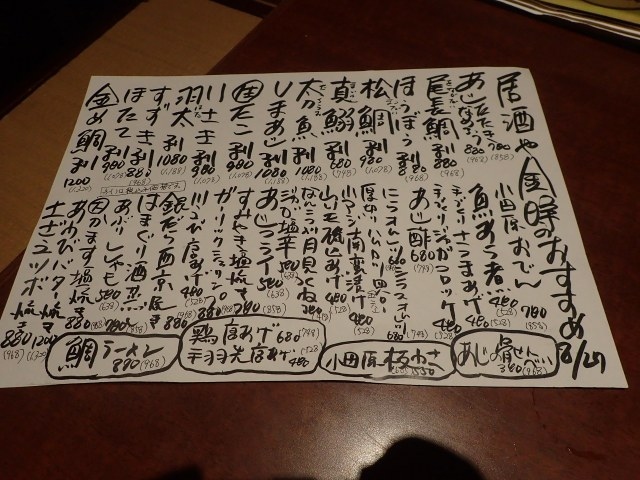 テレビ番組で紹介されていたので小田原へ行く用事があった夜、入ってみた。かなり盛況で、予約しておいてよかった。いろいろ注文したが、アジは刺身、なめろう、酢漬けの3種をトライ、どれも美味しかった。