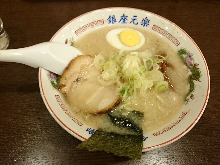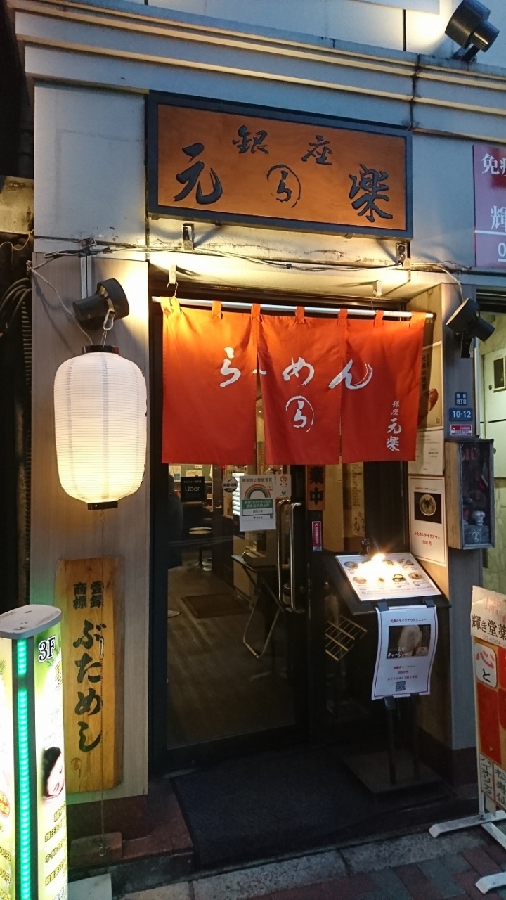中央区銀座4丁目にあるラーメン屋さんです。夕食で楽ラーメン(塩ラーメン)をいただきました。具は海苔1枚、チャーシュー、メンマ、味玉、長ネギで、背脂たっぷりの塩スープとやや太めで歯ごたえのある縮れ麺の一品です。ちょうど良い塩加減で背脂の多いスープがシコシコ麺と良く絡み美味しくいただきました。またチャーシューも柔らかくとろける感じで絶品。久しぶりに完成度の高い塩ラーメンに出会いました。