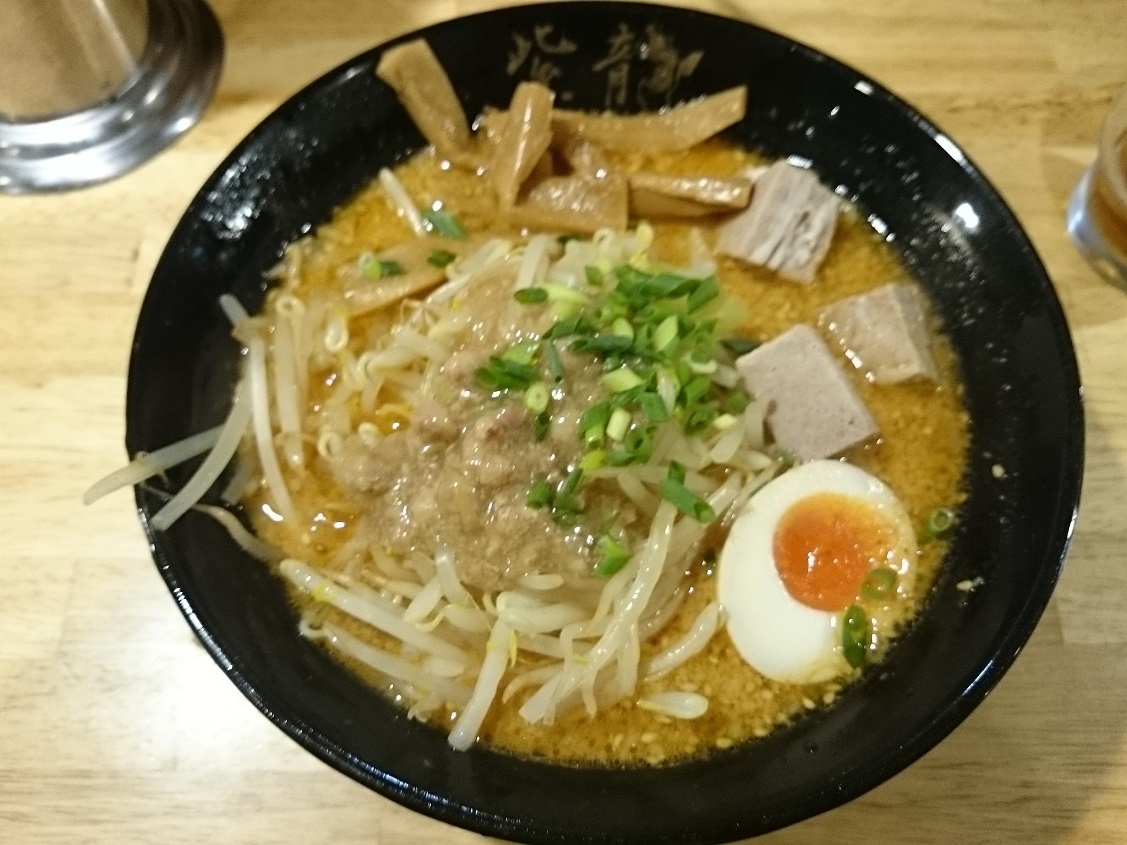 中央区銀座3丁目にあるラーメン屋さんです。夕食で味噌らーめんをいただきました。具は角切りのチャーシュー、メンマ、ゆで卵、チャーシュー、モヤシで、味噌の香りの強いスープとコシのある中華麺の一品です。味噌の他にいろいろな出汁が効いていて独特な味のスープに仕上がっている印象です。