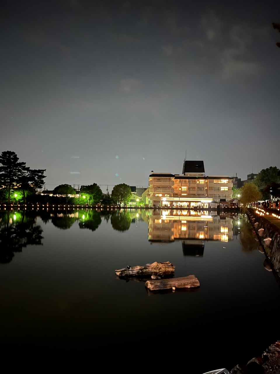 今回は、友人と燈花会で来ました。池のほとりの地面にもたくさんの燈火が置かれて、これだけの準備をするのは大変だったと、頭が下がる思いでした。風のない日で、池のほとりにあるスターバックスが水面に映り、お昼とは違った幻想的な風景を楽しめました。