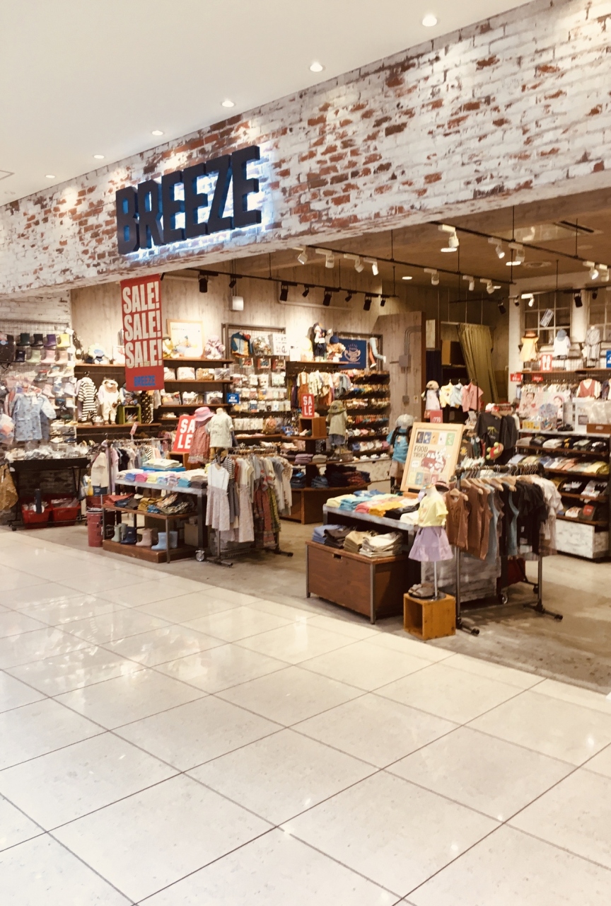 店内は、薄い茶系の色ぽい印象で、置いてある服類モール偶然か、うすい茶系のものが多かったような気がしました。小さなサイズのものが多かったので子供向けの店ぽく、出入り口上のレンガぽい模様がかっこよかったです。セールの文字が目立ちました。