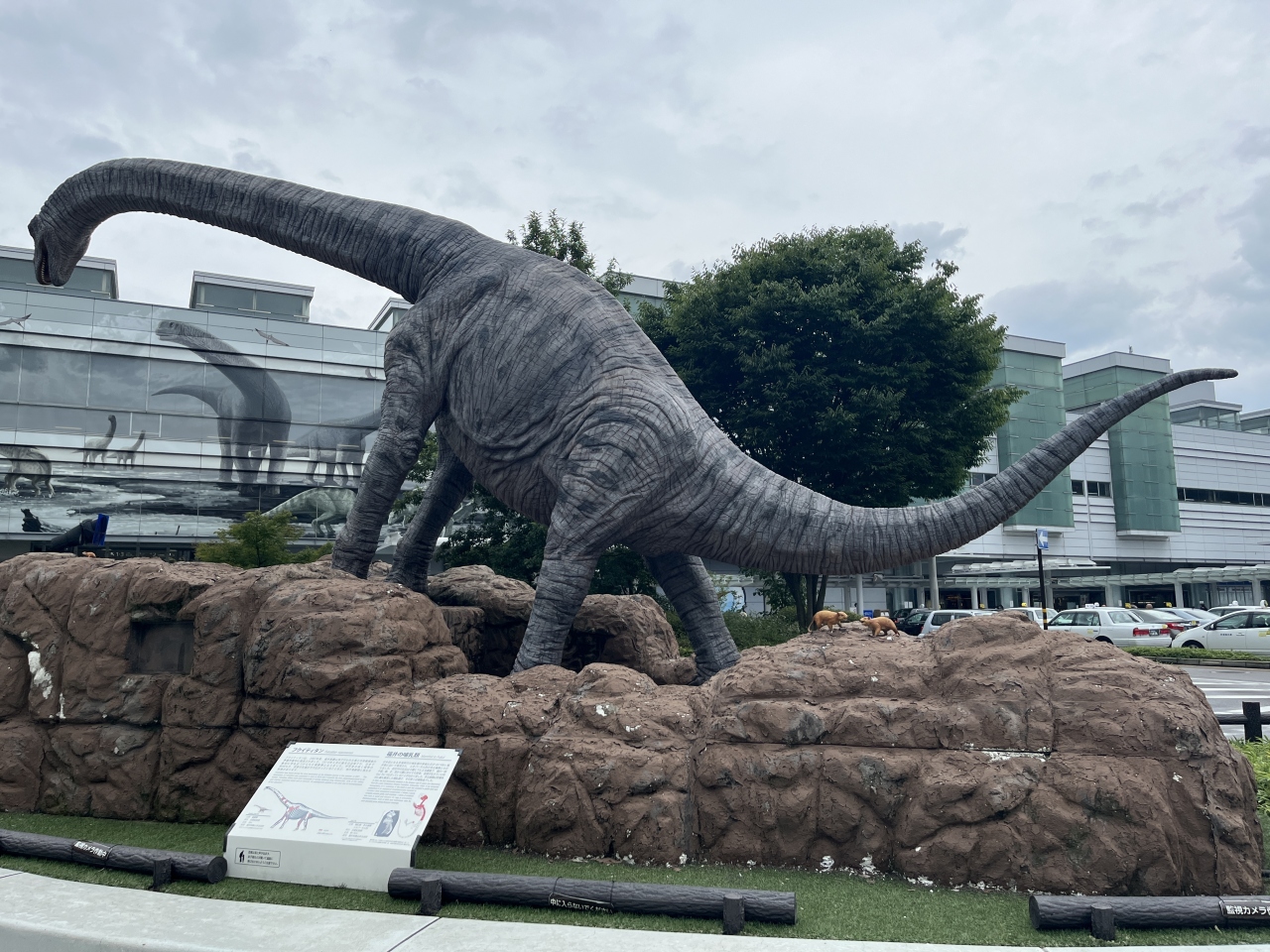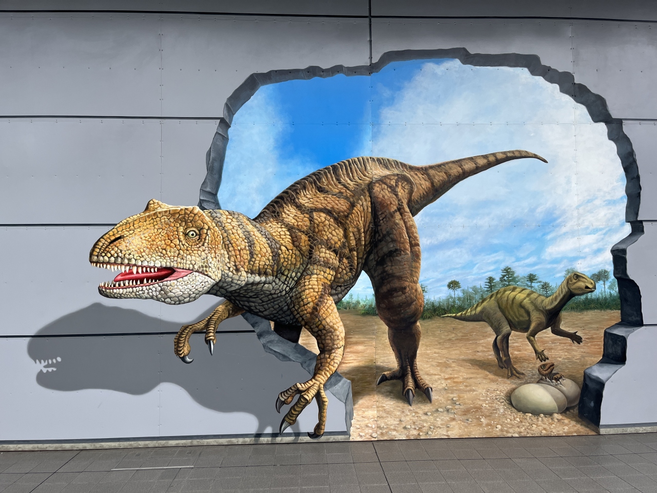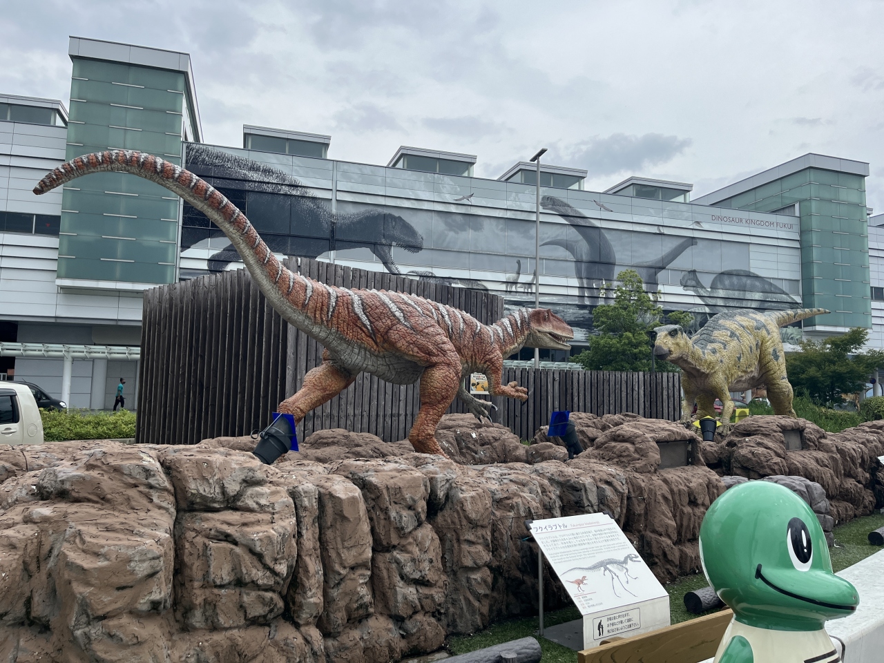 JR福井前にある広場で、恐竜の動くモニュメントが置かれています。駅舎の壁には恐竜のトリックアートもあり、どちらも写真を撮っている人がたくさんいました。今回はルートの都合上、恐竜博物館に行ってからこちらにも行くことになりましたが、博物館に行く前に立ち寄っても気分が盛り上がるかもしれません。