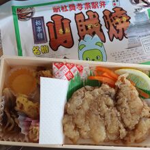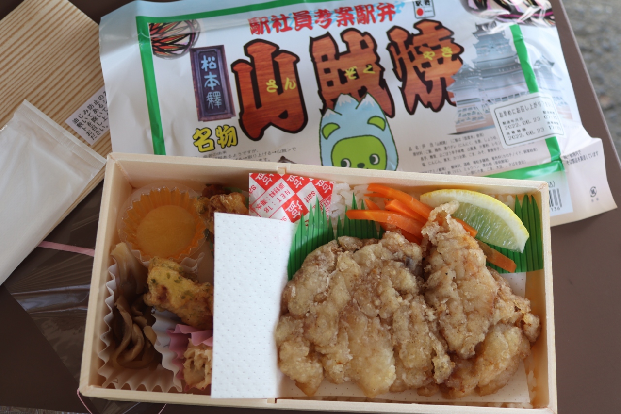 駅員が考案したという山賊焼弁当をいただきました。鶏もも肉を醤油などで下味をつけてカリッと揚げた松本のB級グルメで、そのままごはんの上に載っています。あぶらがごはんにしみないようにビニールシートで仕切られています。意外とボリュームあり、コスパもいい。