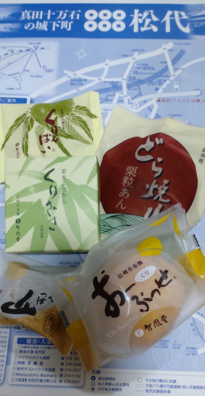 松代城跡の駐車場のすぐ隣にあります。立派な店構えをしています。当初 喫茶席にて甘味をいただく計画でもありましたが、ホテルバイキングからの時間があまり空いてなく、いくつかのお菓子を買ってきました。どれも栗餡が特徴です。店内は、喫茶席も含め お客さんはいませんでした。