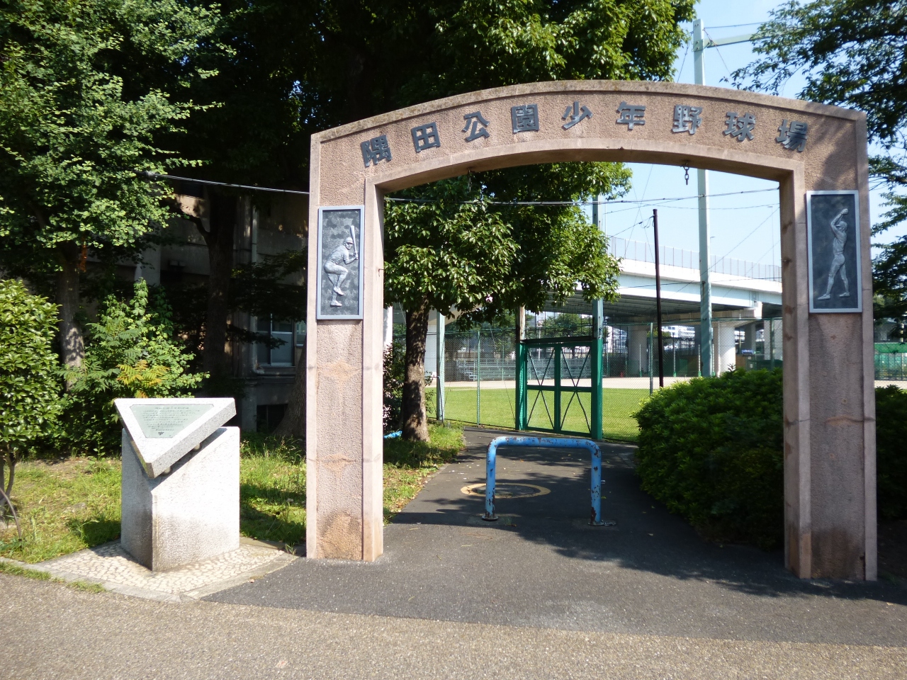 隅田公園の最北端、隅田川の左岸に「隅田公園少年野球場」があります。ここは、あの王貞治さんが少年時代に野球をしたことで知られています。野球場入口に設置された門には、一本足打法の王選手のレリーフが埋め込まれているのが良いと思いました。