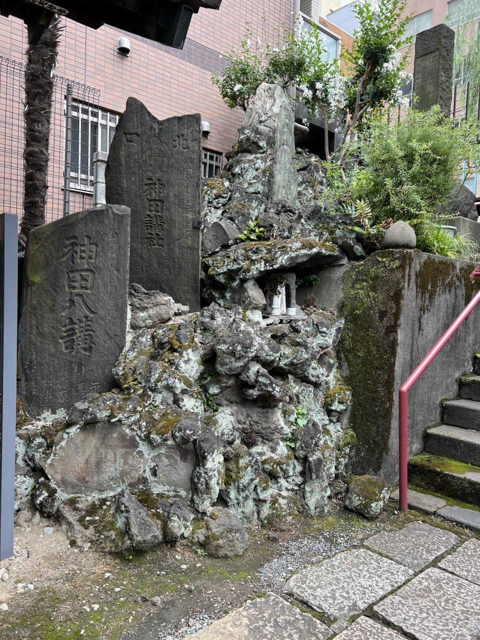 神田講社、神田八講などと刻まれた石碑が、柳森神社の境内の一角に集められています。最初、その石碑群が建てられいる所が富士塚のように見えたんですが、後で調べてみると富士塚ではありませんでした。実際昔は富士塚があったそうですが、すでに取り壊されたとのこと。