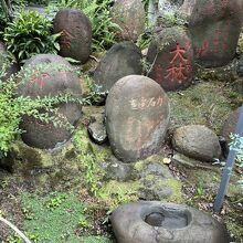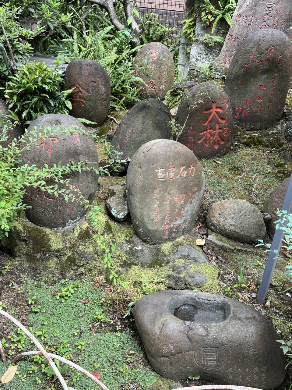 境内の一角に、たくさんの力石が集められています。力石の力比べは江戸時代に流行ったものという印象ですが、こちらの石は大正や昭和の日付けのもあり、比較的新しいものなのかなと思いました。柳森神社お参りの際合わせての見学をお勧めします。