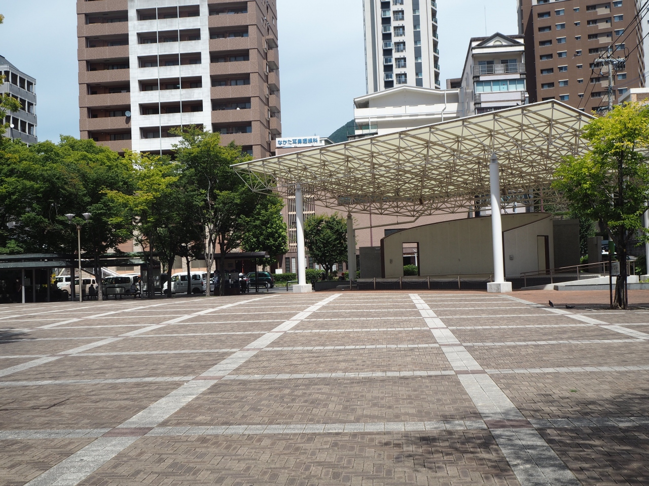 佐世保市街地のアーケード街の中ほどに島瀬公園はあります。公園に面しては佐世保市博物館美術センターもあります。公園の一角には屋根付きのステージがあり、イベントなどの行事がしやすい感じなっていました。公園は芝生で、まわりにはイスなどもあるのでゆったりとすることもできます。