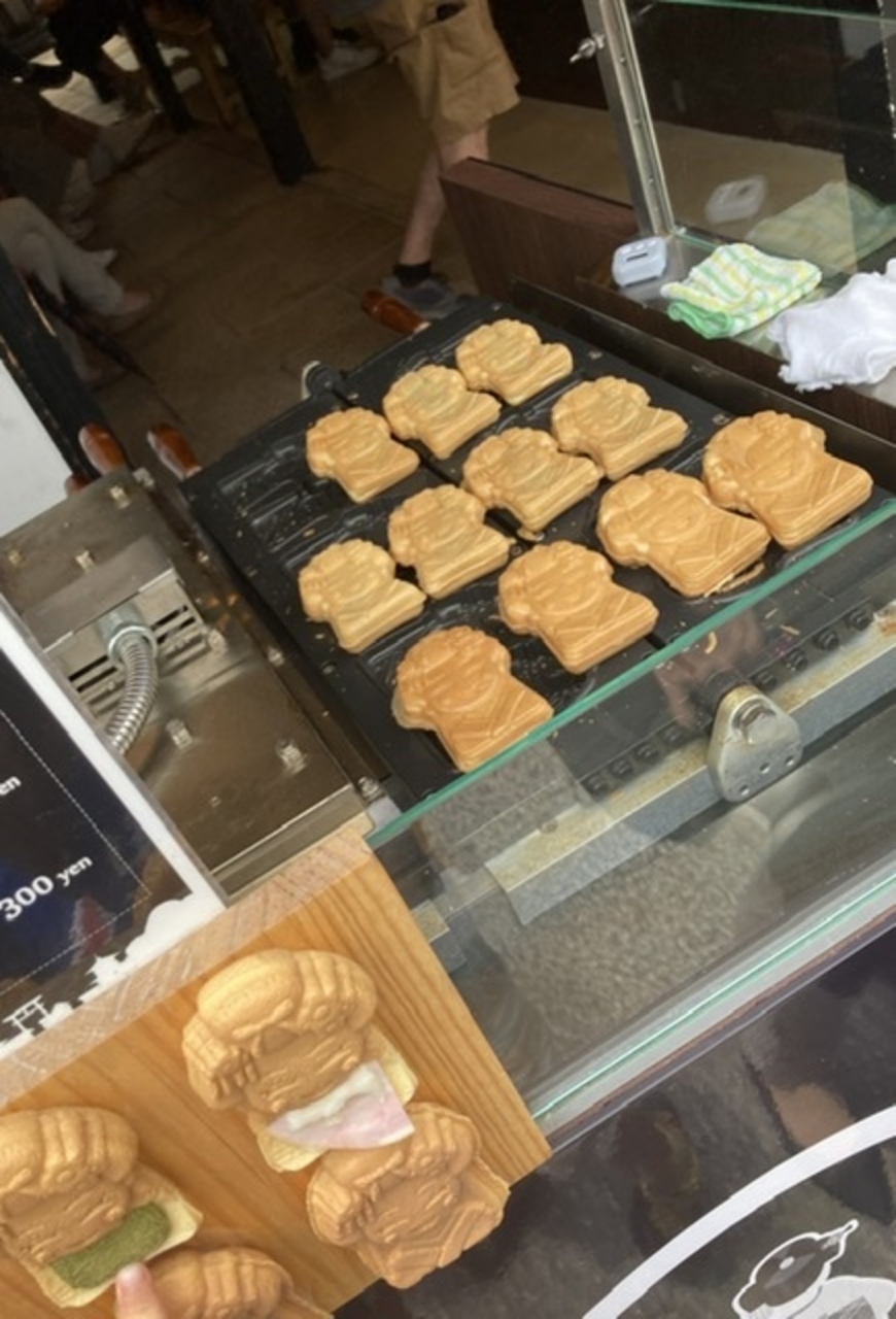 前には舞妓焼きという、大判焼きのような、中のクリームは種類が多いお菓子が売っています。