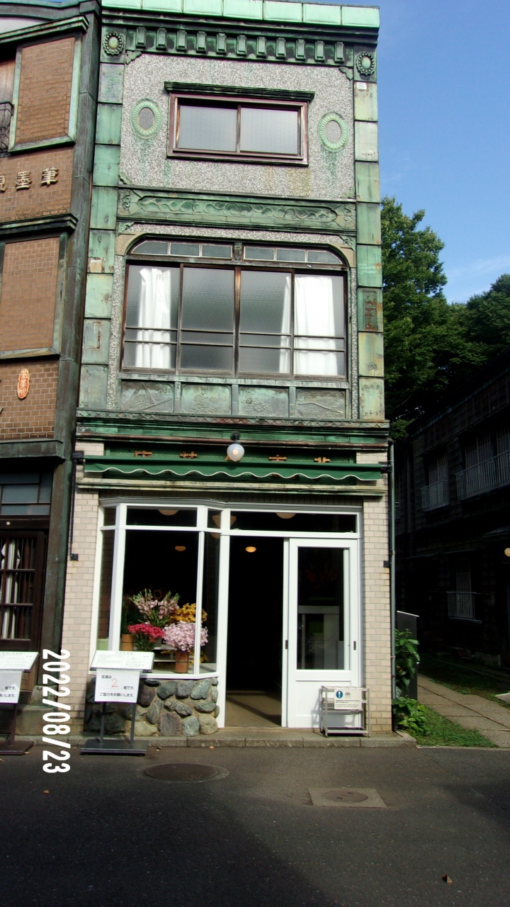 この花市生花店はたてもの園の東ゾーンで下町中通りに面しています。3階建ての建物です。外壁は銅板で覆われています。関東大震災後に多くの建物に見られます。この花屋は1階を店舗として造られています。生活は2階です。外壁の3階部分は装飾がされていて当時の技術の高さを残しています。神田淡路町にあったのです。