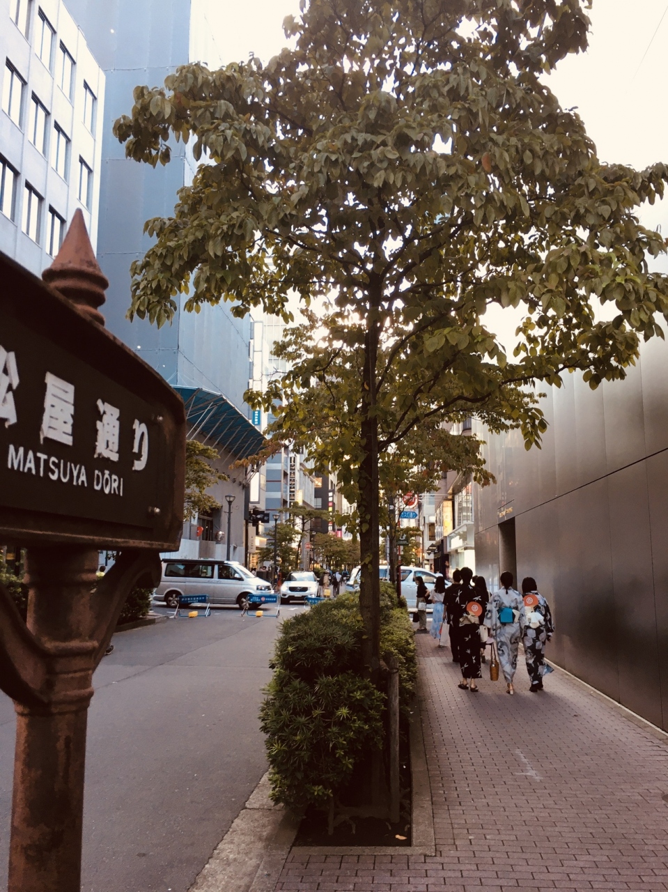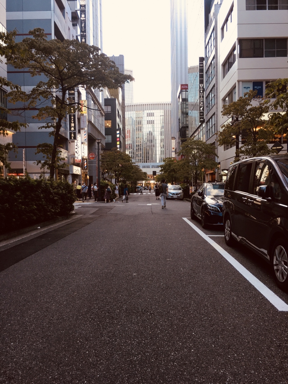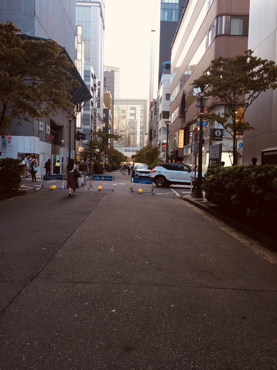 有楽町駅付近からデパート松屋まで繋がる裏道で、裏道と言っても人通りが多く賑わっている通りでした。歩道と車道の間にはさりげなく木が立っていて、車道には駐車スペースもありました。土曜には行ったので歩行者天国になっていました。