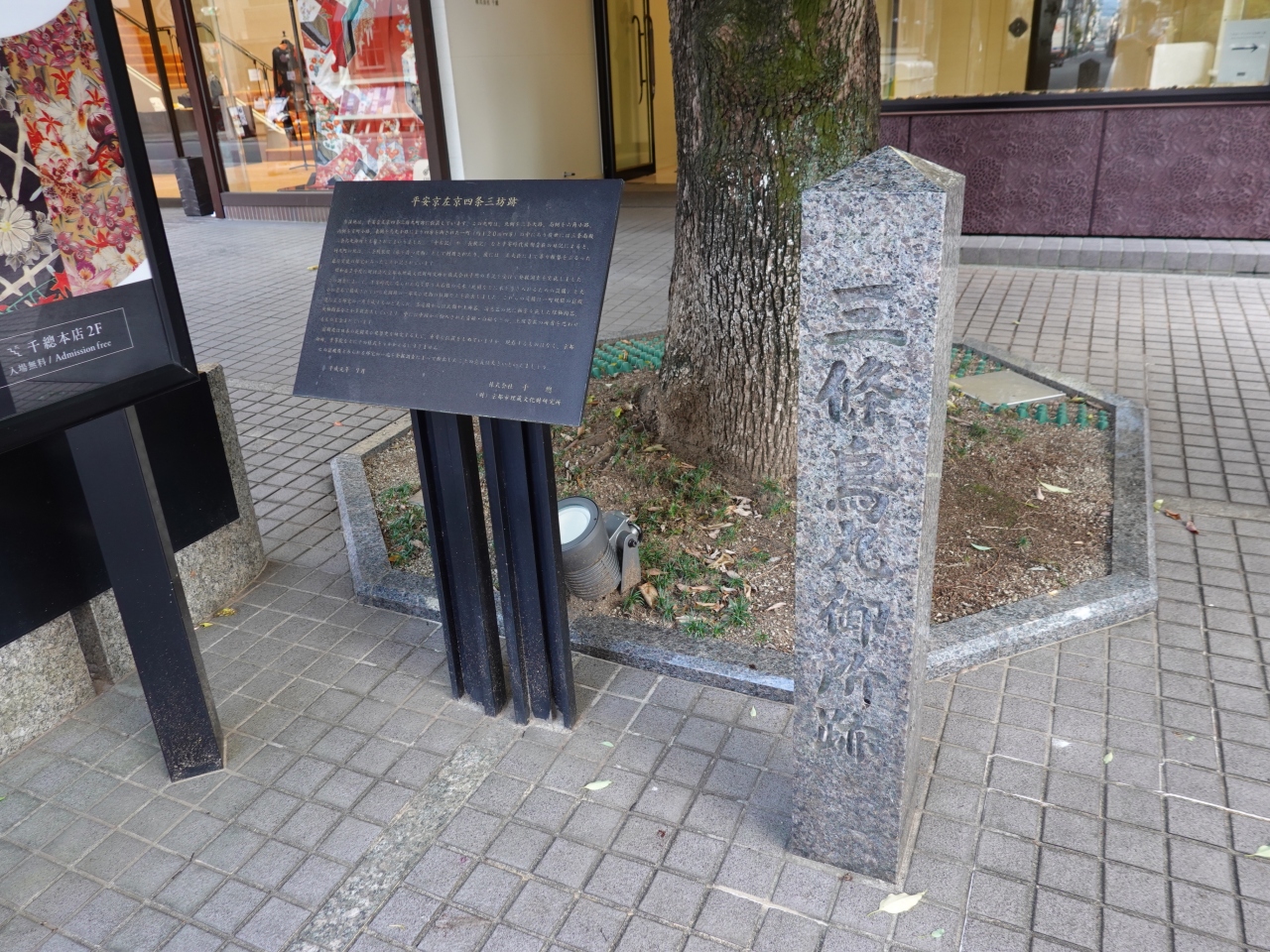 ニューアルオープンした新風館の一画にあるエースホテルに泊まった際、近隣を散策中に通りかかった案内板です。三条通り沿いの千總のビルの前にあります。平安京の遺構の一部が見つかった場所ということは分かるのですが、正直あまりピンとこない史跡でした。
