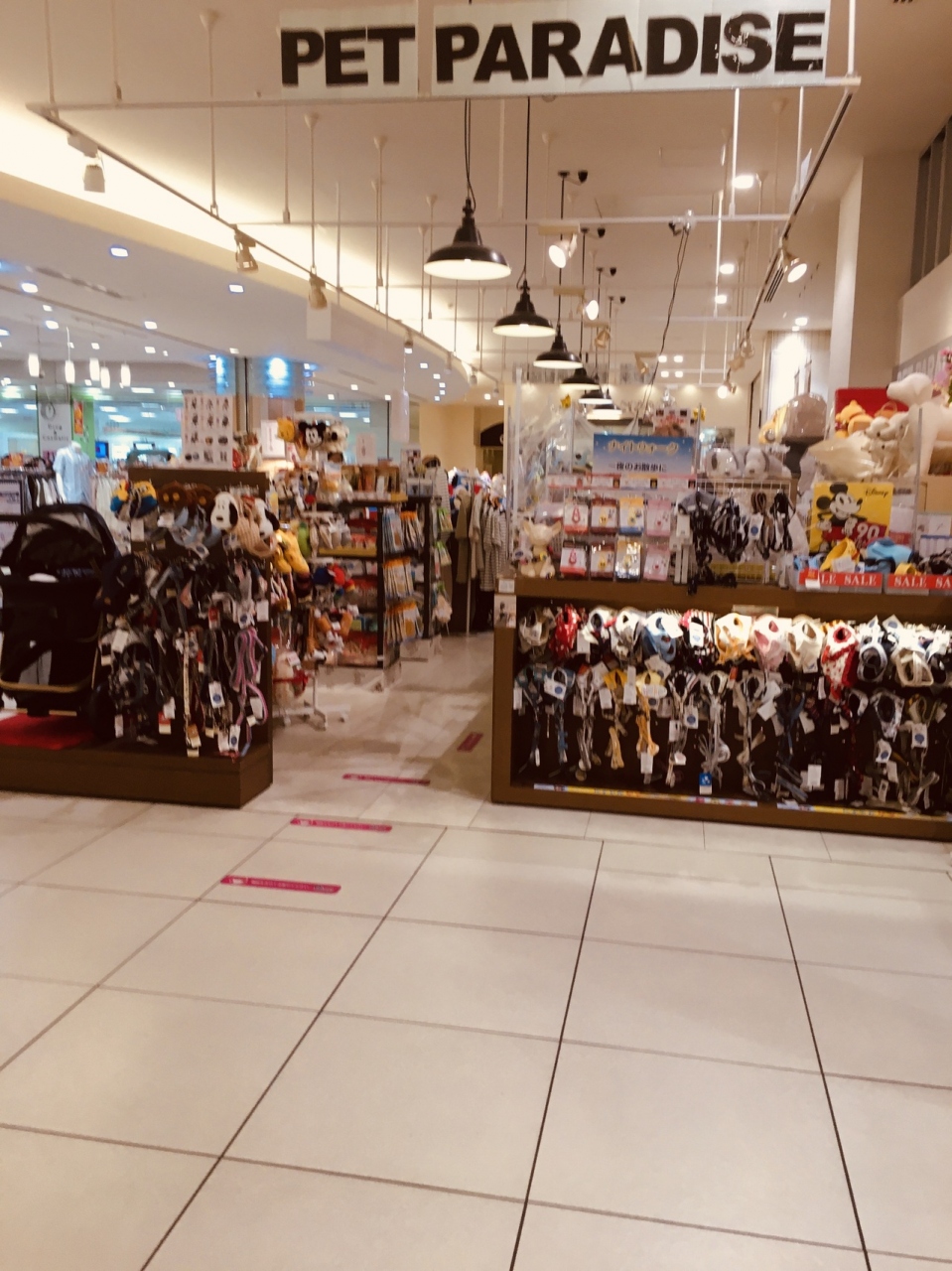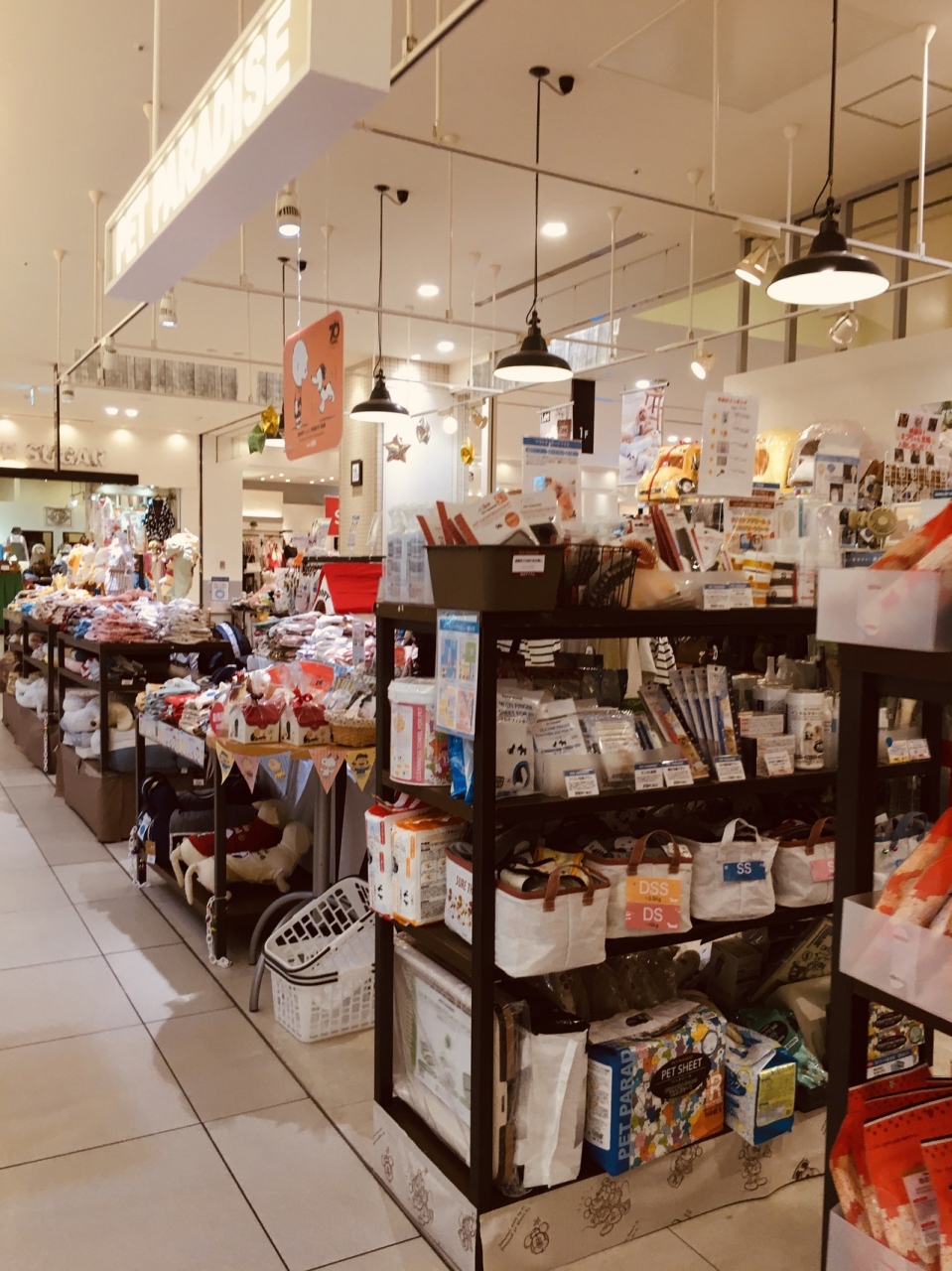 あべのキューズモール館内の通路沿いにある露天商ぽい店。ペット専用の店ですが、ペット以外にも人でも使えそうな商品もたくさんありました。犬用の商品が多く、夜の散歩でも便利な光るナイト商品もあり、帽子がたくさん置いてありました。