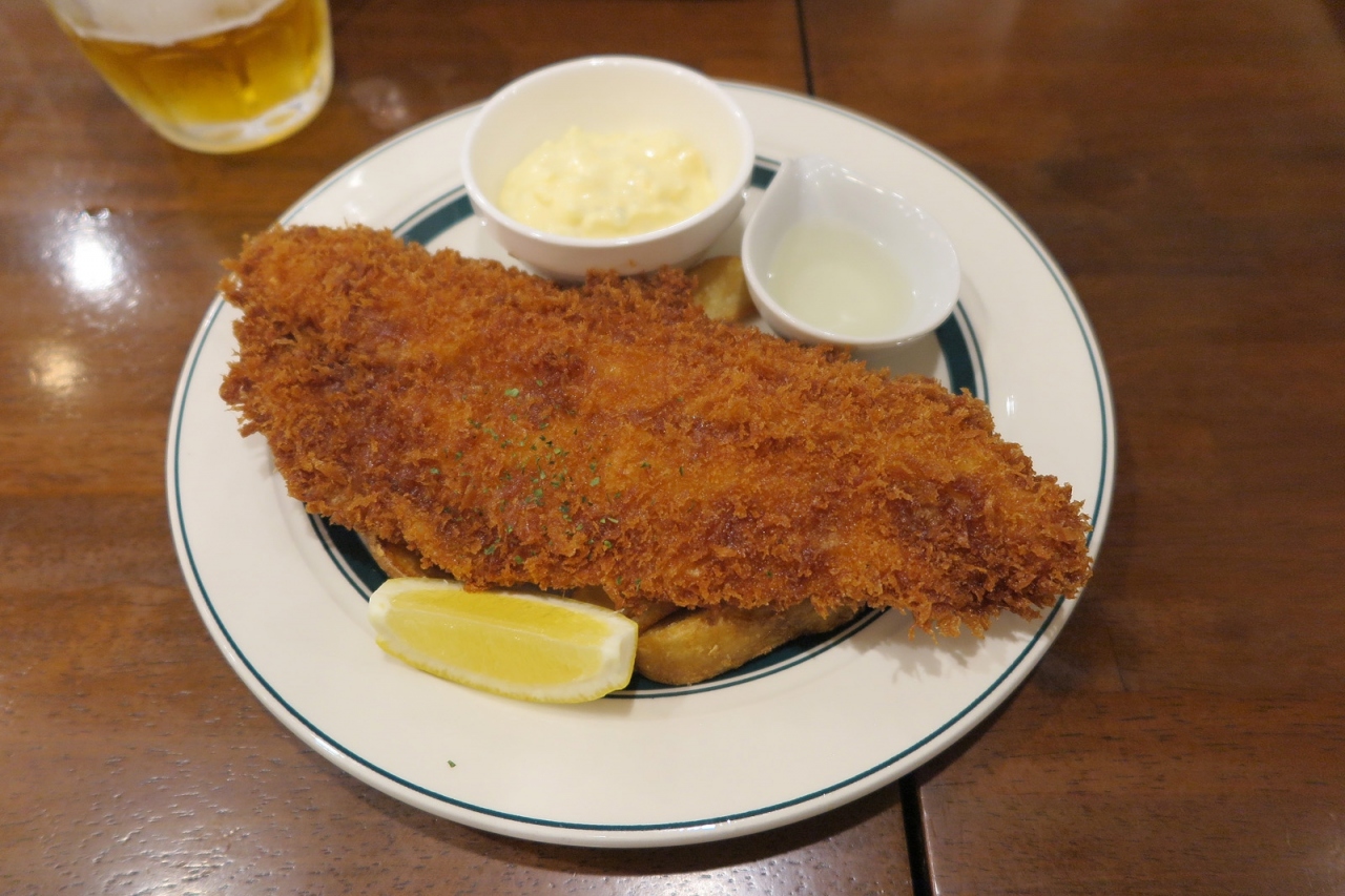 荻窪での夕食、チャチャッと済ませたいと思ったので駅直結の「ルミネ荻窪」5階のレストラン街へ向かいました。ビールも飲みたかったということで、選んだのはちょっと大人の雰囲気の「洋食亭ブラームス」。料理にハーフサイズがあるのは一人利用者にとっては良いことですね。好物のフィッシュ&チップス(990円)も注文しましたが、その大きさはイギリス並!ただ味は…でしたので、もう少し頑張って欲しいな。