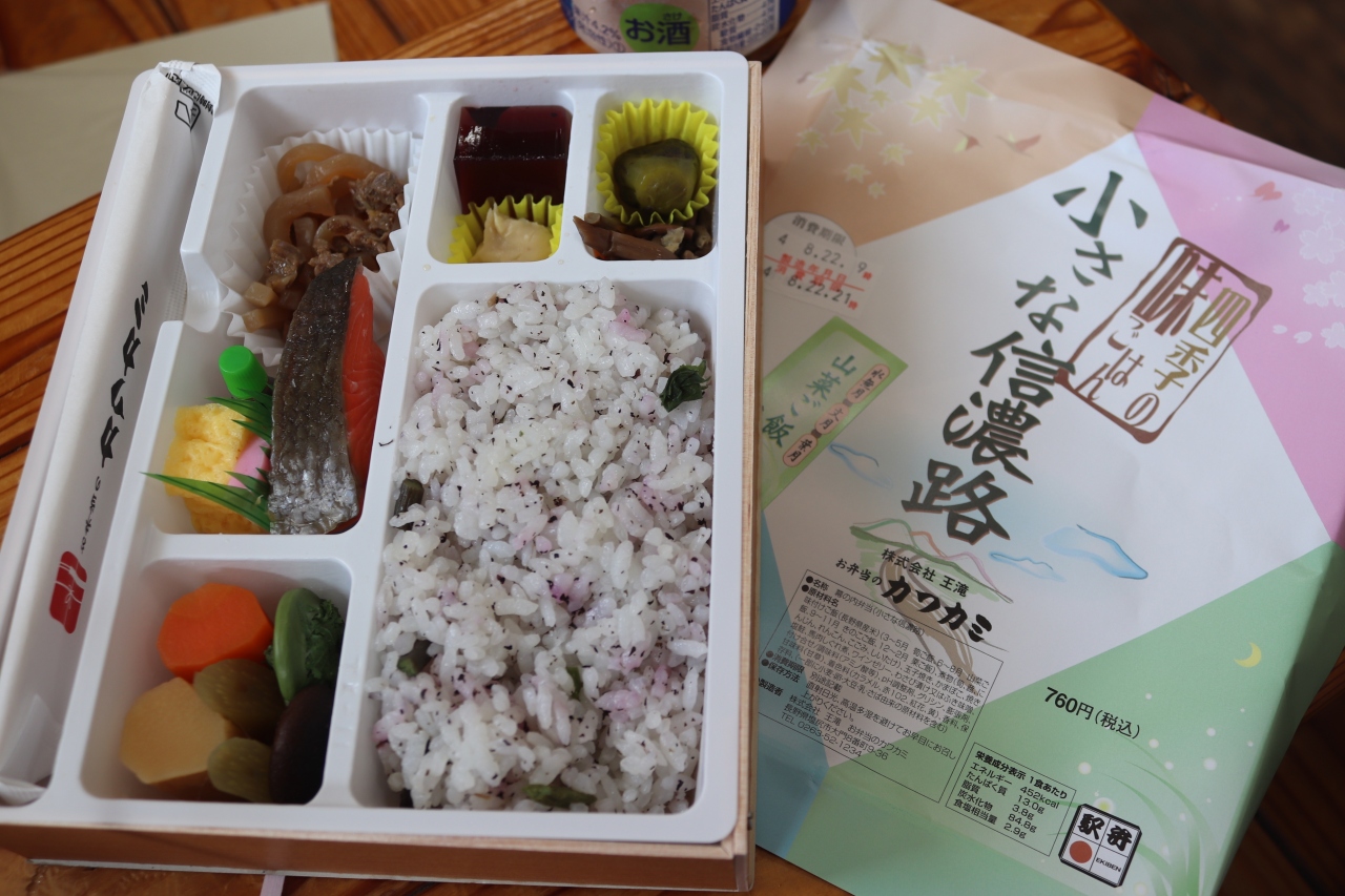 松本駅改札内にある駅弁売店です。松本駅のイイダヤ軒、塩尻駅のカワカミの駅弁を扱っています。地方の駅では珍しくラインナップは豊富で迷ってしまうほどです。小さな信濃路をいただきました。季節によって内容が変わるカワカミの駅弁です。