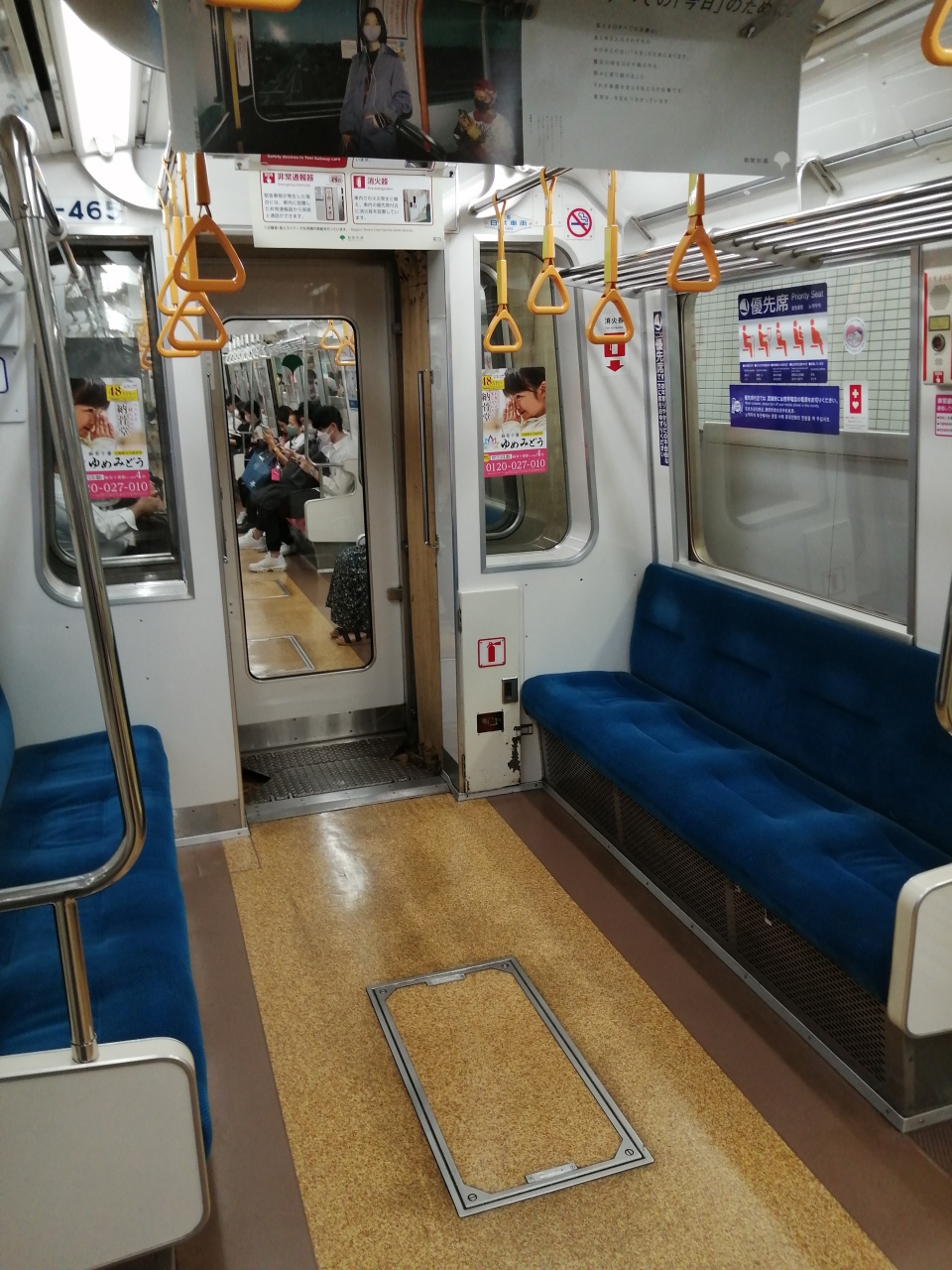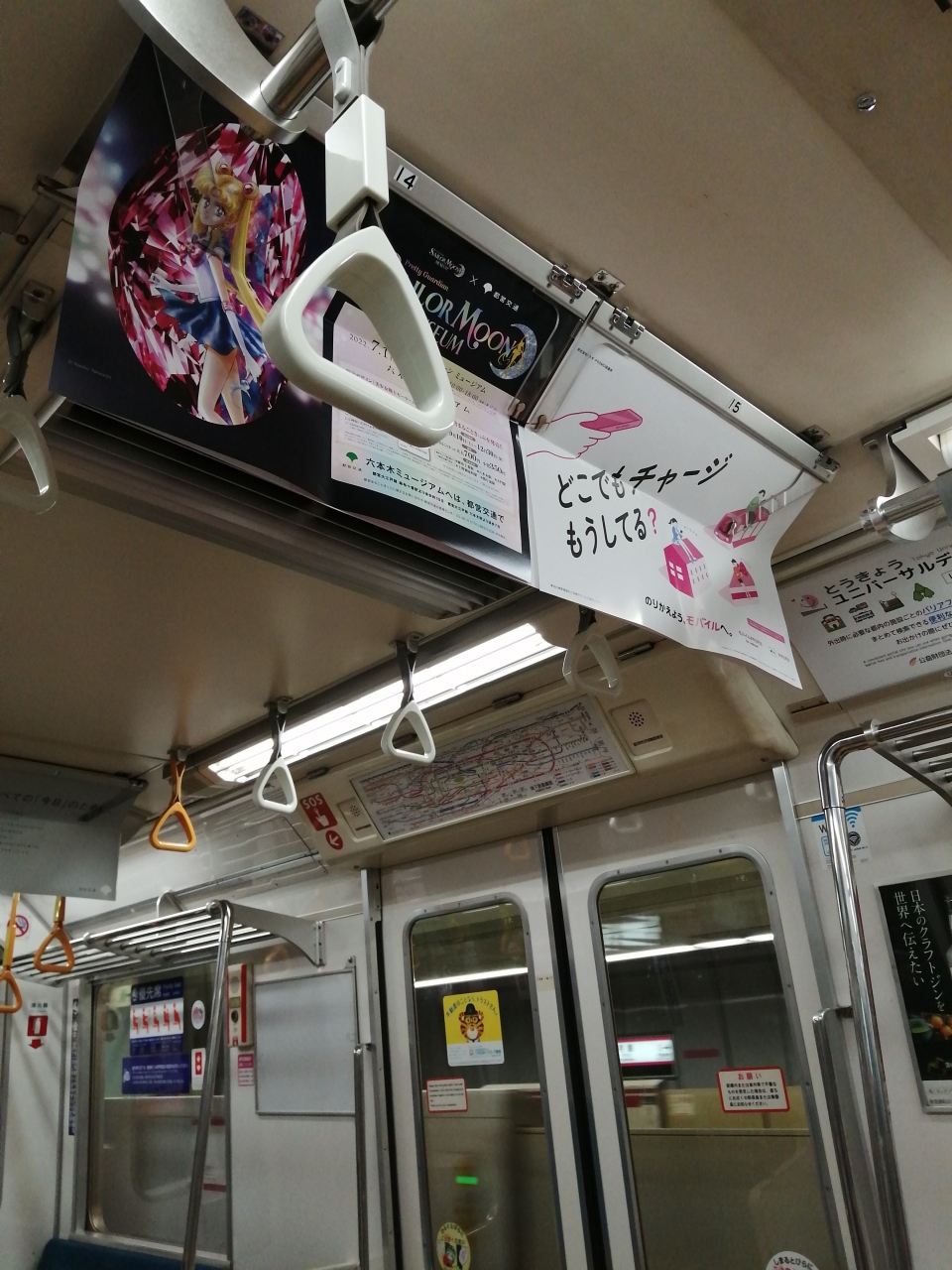 都営大江戸線の車体は他の電車に比べて一回り小さいです。モノレールなんかとサイズが似ている気がします。天井も低いので、ふつうの吊り広告は人の頭に当たっちゃうので、斜めの折られて吊ってあり、それが独特です。