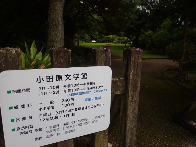 近くを街歩きしていて、この文学館に遭遇した。あいにくと休刊日の月曜だったので、中に入れなかったが、敷地内を少し除くだけで、雰囲気はわかった。まず案内板に常設展として北原白秋の童謡館のほか、北村透谷、尾崎一雄、坂口安吾らの展示があることもわかった。近くにバス停があり、週末などに走る観光回遊路線で、小田原駅からのアクセスもいい施設だった。