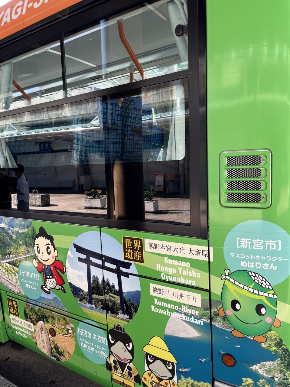 八木駅から十津川温泉に行くのに「日本一長い路線バス」に乗りました。車体には、経由地な五条や十津川温泉の観光名所のイラストがプリントされています。途中に五条バスセンターや十津川バスセンターで、トイレ休憩を取ります。目玉は谷瀬の吊り橋で20分間停車するので、吊り橋を渡る時間は十分ありましたよ。