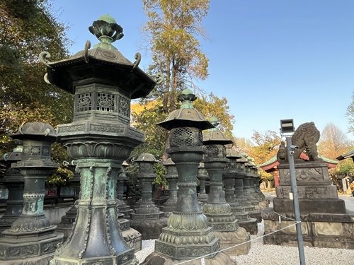 上野東照宮は社殿へ向かって左右に石燈籠が並んでいますが、少し進むと右手を中心に50基ほどの銅製の燈籠が置かれていました。唐門に近いほど御三家など格式の高い大名なのだそうです。刻まれた銘を見ていくと当時の諸国大名の格がわかります。