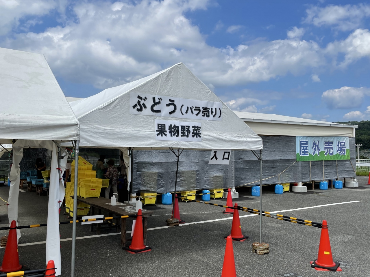 ブドウのシーズンは大にぎわいだ。室内だけでなく、駐車場の一角にテントが張られ、ブドウの大型売り場が出現する。品物は地元のブドウ農家が続々と運び込んでくる。午前9時のオープン直後はよい品を求めて多くの人が来場。少し時間が過ぎるとじっくり探す派の人々が三々五々来場する。個人的にはお盆頃から10月末までがおすすめだ。
