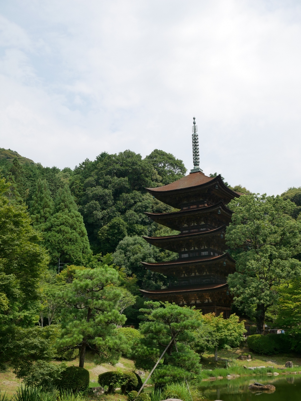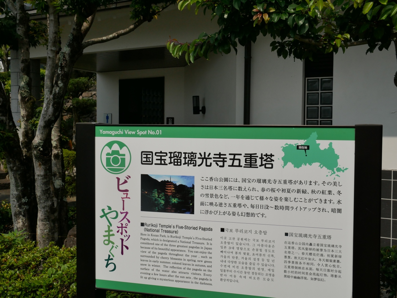 大内義弘の菩提を弔うために建てられた五重の塔だそうですが、小京都山口にふさわしい、きれいな五重の塔です。塔それ自体もいいですが、前面に池、周りは美しい緑(後ろには五重の塔より高い木も)と、周囲の風景とも見事にマッチしていました。