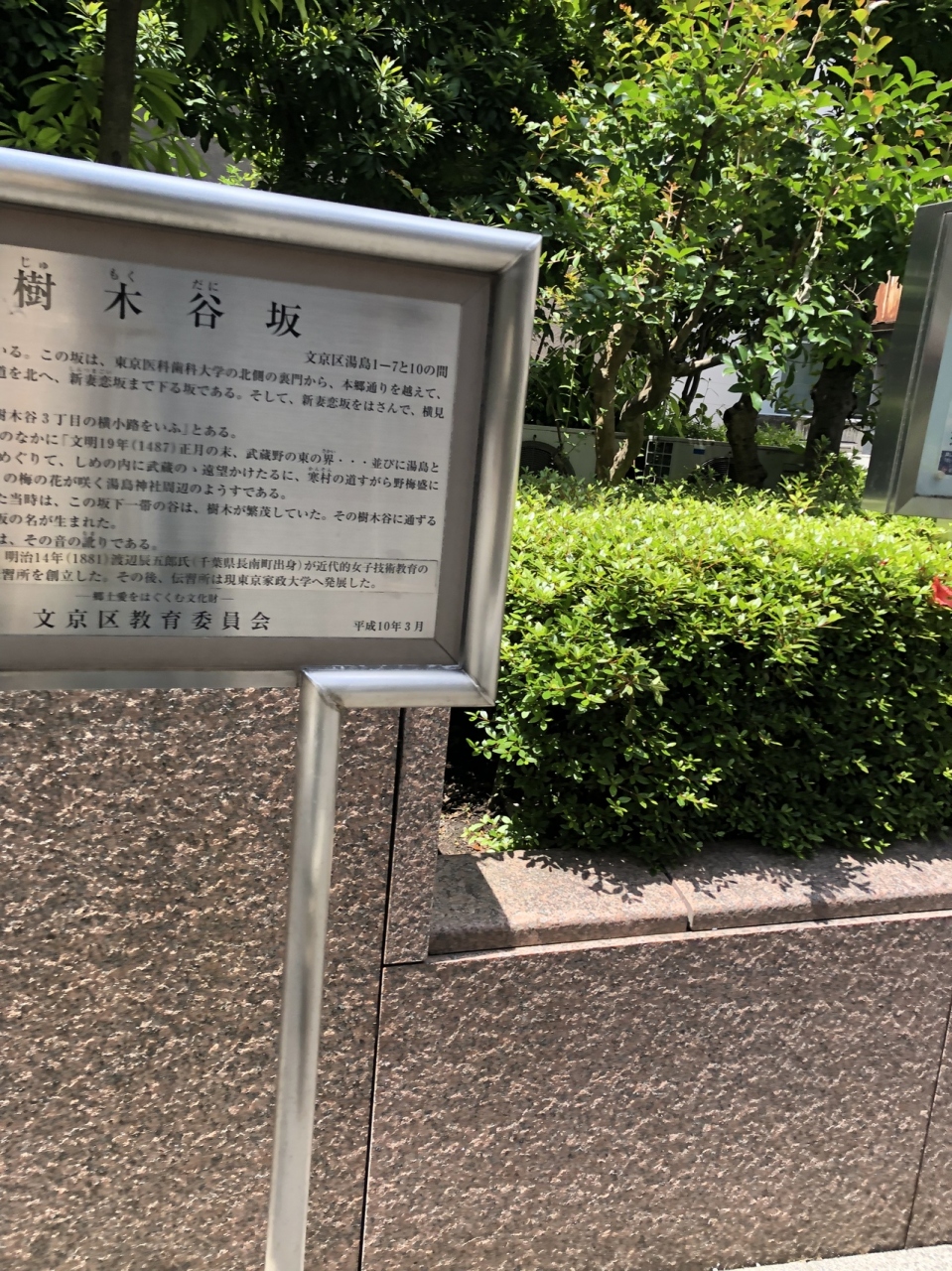 とても短い坂です。坂の途中に、坂の謂れなどについての文章が書かれた金属性のプレートが建っていました。昔は文字通り樹木が茂っていたそうですが、当然のことながら、現在は全くその面影はありません。坂の名前だけに残っています。