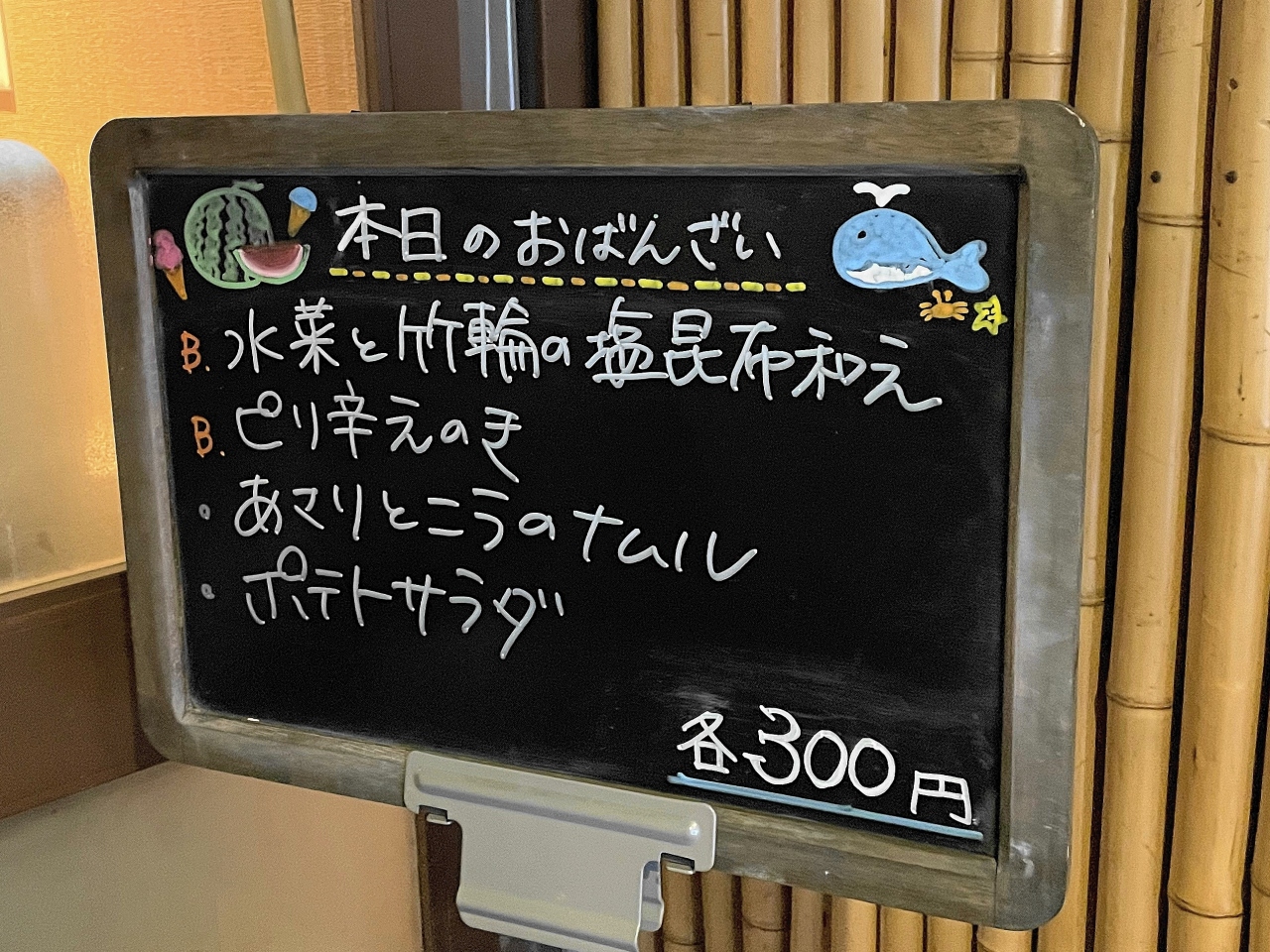 おばんざいは、水菜と竹輪の塩昆布和えとピリ辛えのき。