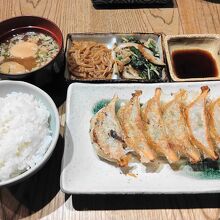 餃子1人前・おばんざい2品・ご飯・お味噌汁のセットです。