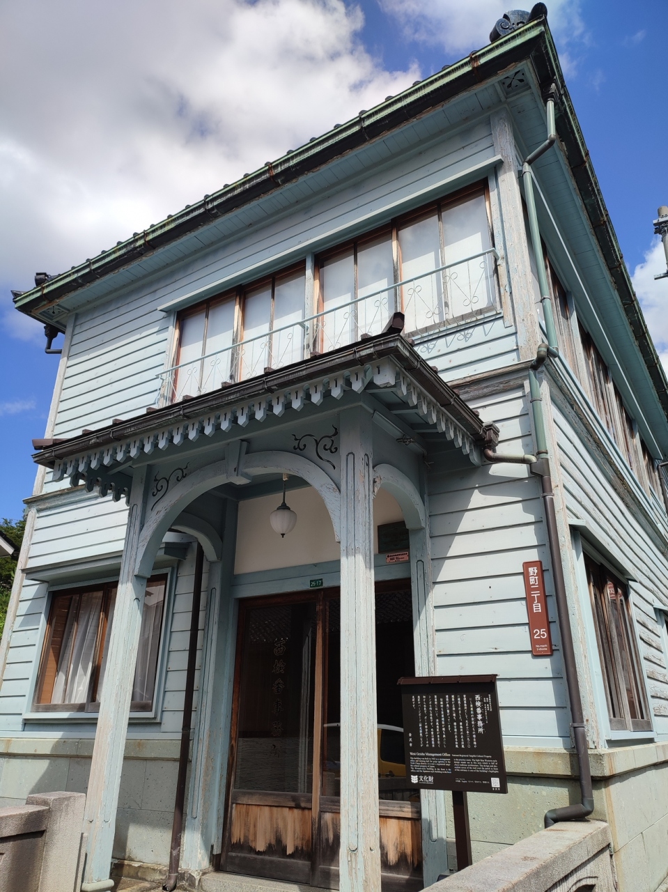 金沢市の茶屋街のひとつであるにし茶屋街に南寄りにあり、西茶屋資料館のすぐ近くです。かつては名称から推察できる管理事務所としての役割以外にも、芸妓さんたちの稽古場としても使われたそう。レトロな洋風の建物なのがちょっと意外でした。