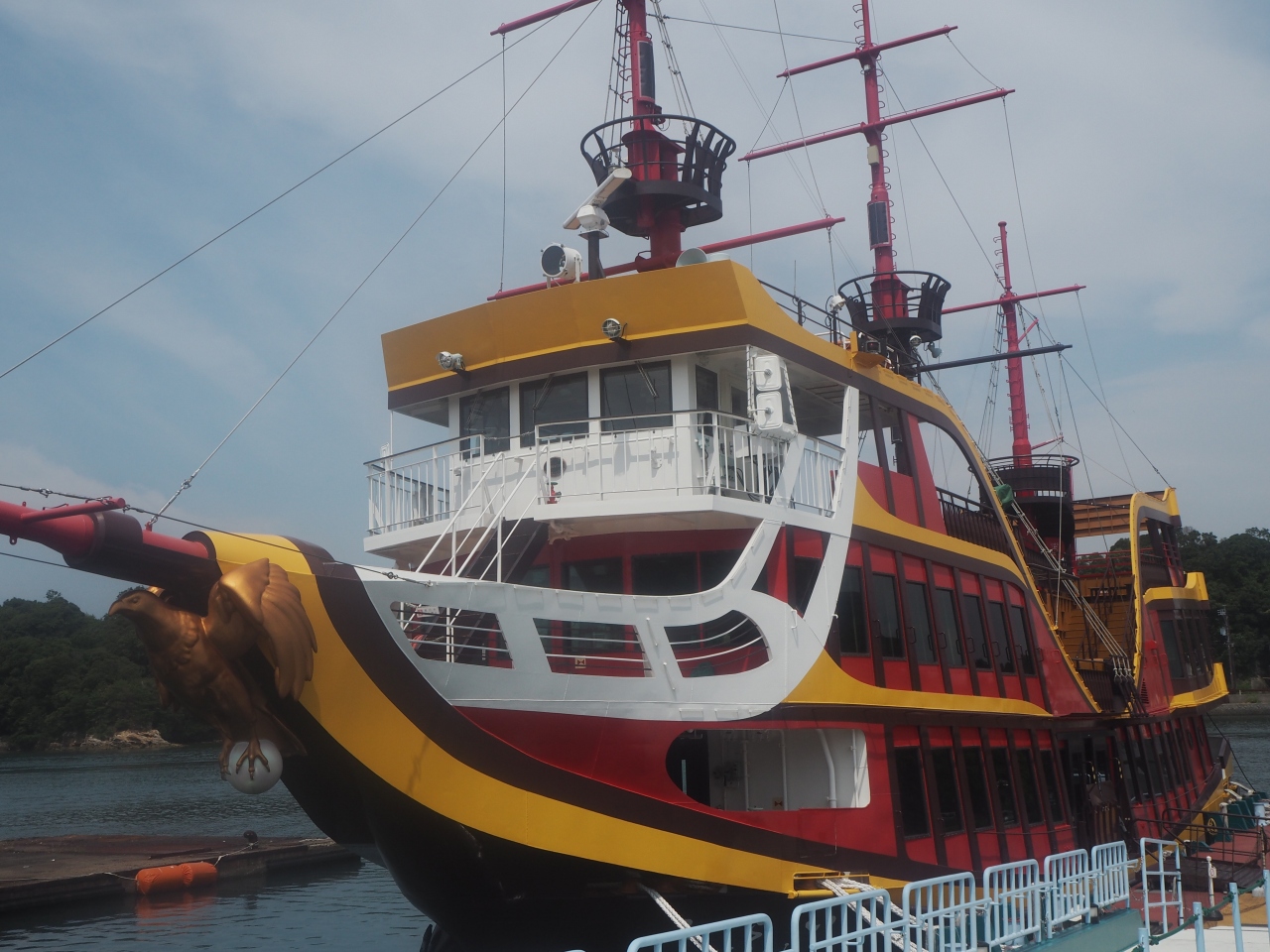 九十九島遊覧は2つの遊覧船で運行されていて、毎時0分にパールクイーン号、毎時30分に海賊船「海王」が出港していきます。50分ほどの運航で帰港します。海王は赤を基調とした海賊船のイメージ通りの船です。サイズ的にはパールクイーン号と同じくらいの大きさです。普段(繁忙期)は2隻の船で遊覧を行うのですが、コロナ禍ということで、海王は休止していました。